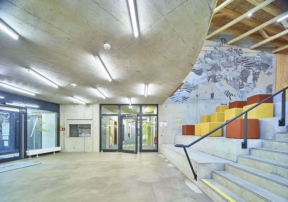 Inhaltlich blieben die Wurzeln erkennbar. Denn weiterhin müsse „Gemeinschaft erlebt“ werden können. Doch nun soll dies – sehr zeitgemäß – in „ganzheitlicher Nachhaltigkeit“ geschehen. Ein hoher zentraler Raum mit vielen Durchblicken und ungewöhnlicher Gestaltung soll die Gäste stets „staunen“ lassen. Die architektonische Forderung nach authentischer Materialität wurde griffig in die Formel „hart aber herzlich“ übersetzt. Und weil die Bewohner gelegentlich recht grob mit den Herbergen umgehen, wurde die einfache und robuste russische Raumstation MIR zum ideellen Vorbild genommen und nicht – so LAVA – das eher empfindliche Hightech-Pendant der ISS. Für den Bayreuther Neubau wurde ein y-förmiger Grundriss gewählt, bei dem sich der lange und die beiden kürzeren Flügel in einem durchaus spektakulär über mehrere Geschosse reichenden Zentralraum treffen, der nun alle Funktionszonen beherbergt. Die geforderte „erlebte Gemeinschaft“ ergibt sich dort fast von alleine. Und für das erhoffte Staunen unter den Gästen sorgten die Architekten aus dem „Laboratory for Visionary Architecture“ (denn genau dies bedeutet die Abkürzung LAVA) mit ihrer bekannten CAD-geprägten Entwurfshaltung aus komplexen fließenden Formen. Weil aber – siehe oben – die eher grob konstruierte russische MIR Pate stehen sollte, verkamen die eleganten Fassadenschwünge nicht zum formalistischen Selbstzweck. Sie erschließen stattdessen das Haus über mehrere schiefe Ebenen hinweg, ergeben ganz nebenbei so manche barrierefreie Rampe, verknüpfen innen mit außen und vermeiden eine langweilige Aneinanderreihung der 45 Zimmer.