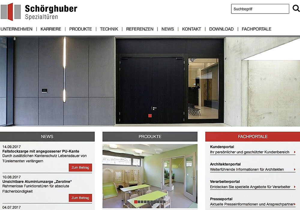 Modern und benutzerfreundlich gestaltet, mit hohem Informationsgehalt und auf dem neuesten Stand der Technik – so präsentiert sich seit Kurzem die neue Website von Schörghuber. Der Spezialtürenhersteller hat seinen Online-Auftritt rundum überarbeitet und hält für Architekten, Händler und Verarbeiter nicht nur ein neues Design, sondern auch neue Funktionen und Inhalte bereit. „Wir setzen auch im Netz auf direkten Kundenkontakt und einen professionellen Markenauftritt. Somit haben wir uns für den Relaunch unserer Website entschieden, um im digitalen Zeitalter noch besser aufgestellt zu sein und unsere Partner on- und offline optimal zu unterstützen“, erklärt Jürgen Ruppel, Geschäftsführer bei Schörghuber. Die neue Website ist besonders benutzerfreundlich gestaltet und durchgängig responsive angelegt, sodass sie sich verschiedenen mobilen Endgeräten automatisch anpasst. Das Design der neuen Website zeichnet sich durch eine modern gestaltete Kacheloptik und großflächige Fotografien aus. Insgesamt neun Rubriken fassen die wichtigsten Themen inhaltlich zusammen und verschaffen den Benutzern einen schnellen Überblick. Besonderer Wert wurde bei der Neuauflage des Web-Auftritts auf die Darstellung der Produkte und der Referenzen gelegt. Da bei der Wahl der Schörghuber Türen in erster Linie der Anwendungszweck und die Funktion entscheidend sind, ist auch die Rubrik „Produkte“ danach aufgebaut. Gewählt werden kann somit zwischen Türen nach Anwendung wie beispielsweise für den Einsatz in Nass- und Feuchträumen oder nach Funktionen wie zum Beispiel Brand- und Rauchschutz. Ergänzend dazu finden sich unter der Rubrik „Referenzen“ Beispiele aus der Praxis, die die Türen beispielsweise in der Elbphilharmonie Hamburg zeigen. Wer auf der Suche nach technischen Details ist, wird unter der Rubrik „Technik“ fündig. Anstatt im sogenannten „Handbuch“, einem 800 Seiten starken Kompendium, nachzuschlagen, können Schörghuber Partner hier ohne langes Suchen genau die planungsrelevanten Informationen aufrufen, die sie gerade benötigen. Einen besonderen Mehrwert für Schörghuber Partner bieten die neu auf der Website integrierten Fachportale, die unter anderem Informationen zu Produkten und technischen Details beinhalten. Im Architektenportal finden sich zudem Zertifikate, zulassungsrelevante Nachweise und Zeichnungen sowie ein Anmeldelink zu FormCalc, einem eigens von Schörghuber entwickelten Architektenprogramm zur Anfertigung von Ausschreibungen. Um seine Partner stets auf dem aktuellen Stand zu halten, wird ein regelmäßiger Newsletter mit aktuellen Produktinformationen und Unternehmensmeldungen versandt. Unter www.schoerghuber.de/news/newsletter/ können sich Architekten, Händler und Verarbeiter für den Newsletter registrieren.