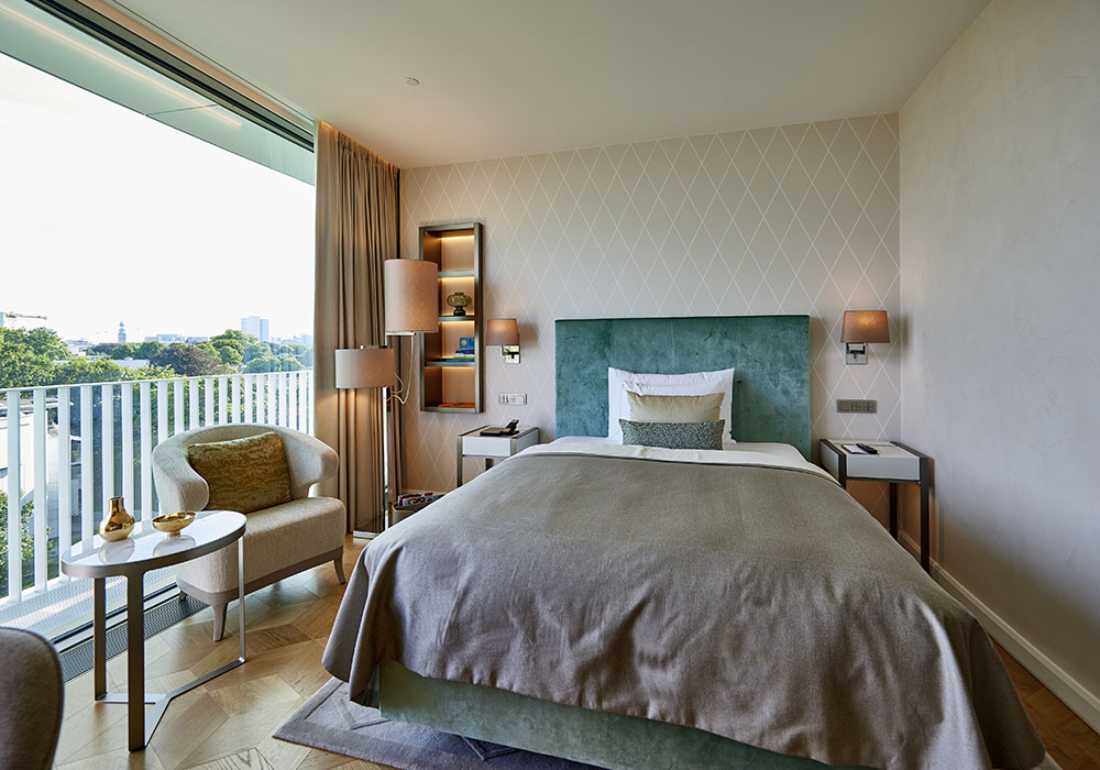 Der in der Hansestadt bestens vernetzte Architekt Jan Störmer hat sich die Sonderform aus drei ineinander übergehenden Kreisen bei einer Rast unter den schattigen Bäumen des parkartigen Geländes überlegt. Denn dieser nicht nur für Hotels eher untypische Grundriss bietet vor allem den Vorteil, dass es kein „Vorne“ und kein „Hinten“ gibt. Aus allen Fenstern schweift der Blick über Alster oder Innenstadt. Ein klarer Fortschritt, denn hätte sich Störmer auf traditionelle Weise an die Bebauung des Blockrandes gehalten, dann gäbe es eben ganz wenig „Vorne“ – und ziemlich viel „Hinten“. Möglich wurde dies durch den großzügigen Zuschnitt des Grundstücks und die bescheidene Flächenausnutzung. Große Rasenflächen und alter Baumbestand des ehemals ersten botanischen Gartens der Stadt Hamburg blieben erhalten. Der Hamburger Logistikunternehmer Klaus-Michael Kühne initiierte den Bau des 130-Zimmer-Hauses und hat damit Anteil an der angeblichen Milliarde, die in Hamburg derzeit für neue Hotels ausgegeben wird.