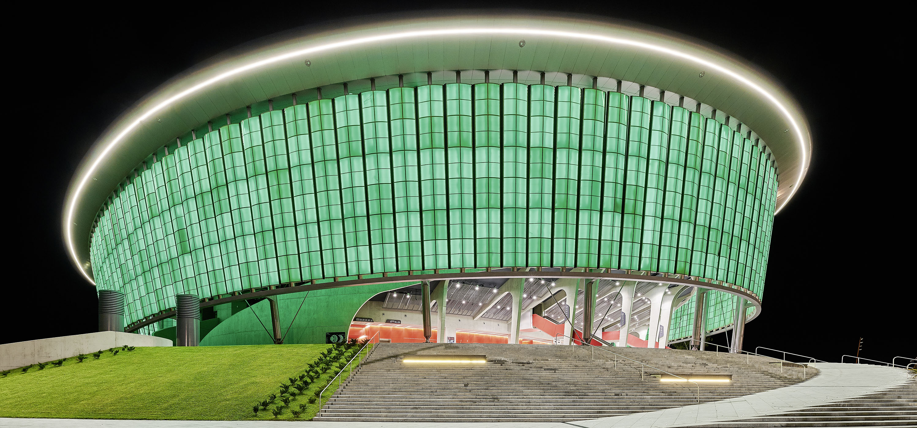 Die eigentliche Bühne von 36 x 18 Metern wird zwischen den Flügeln des Technikgebäudes aus mobilen Elementen und nur während der Konzertsaison aufgebaut. Prägend für die Außenwirkung der Arena sind die umlaufenden und vor allem drehbaren Fiberglas-Lamellen in drei verschiedenen Grüntönen. Die Farben wurden mit Bedacht gewählt, denn die Arena steht völlig frei in einer ansonsten noch ländlich geprägten direkten Umgebung. Die grünen Lamellen nehmen dem großen Bauwerk – zumindest tagsüber – etwas von seiner Dominanz. Je nach Wetter – und dieses kann in der Gegend rasch umschlagen – werden sie geöffnet oder geschlossen. Mit der einsetzenden Dämmerung können die Lamellen dann per LED in beliebiger Farbkombination beleuchtet werden und verstärken den Eindruck auf die ankommenden Konzertbesucher.