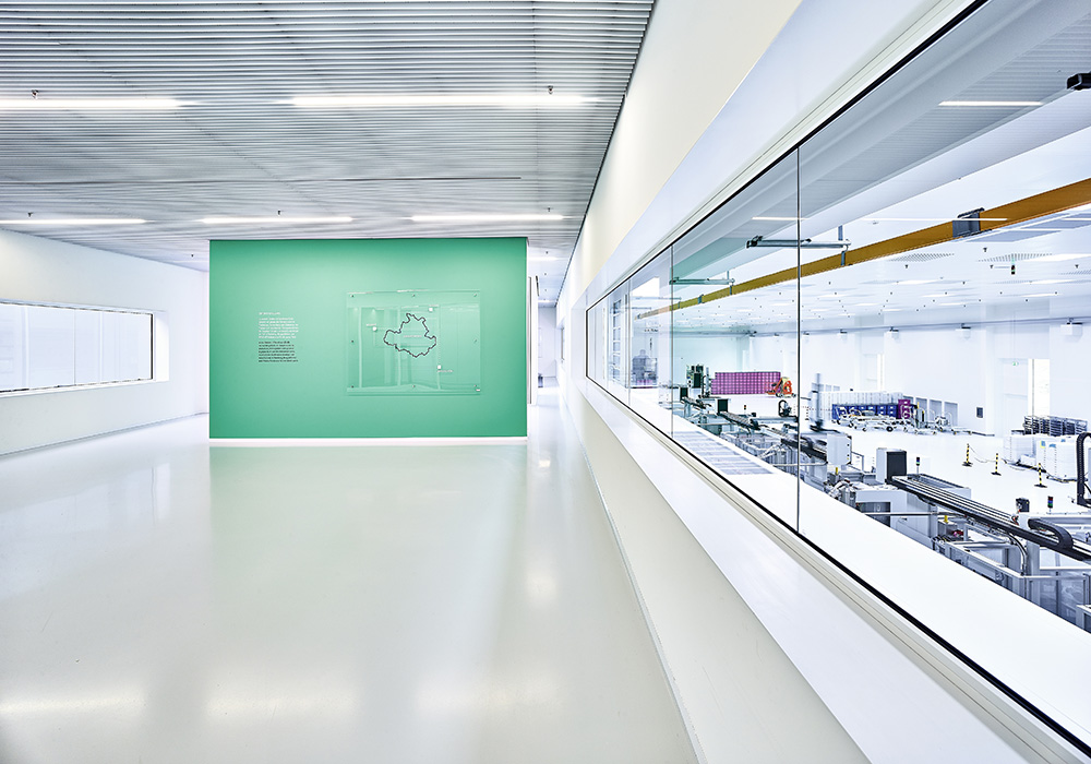 Vorfahrt und Eingangshalle zeigen Haltung, und die baulichen Oberflächen aus Sichtbeton, Glas und Metall sind nicht protzig, sondern wertig. Vor allem aber weisen sie in ihrer detailversessenen Perfektion auf den eigenen Anspruch bei der Produktion hin. Die Reinraumatmosphäre in dieser Fabrik wird nicht nur behauptet – sie wird durch Architektur erlebbar. Eine hochbewehrte und das Dach tragende Ortbetonbrücke überspannt die komplette Fertigung, nimmt die Büros samt Infrastruktur auf und sorgt durch Glasscheiben für ständigen gegenseitigen Blickkontakt zwischen Fertigung und Verwaltung. Die Hierarchien sind flach, Pausenzonen und Cafeteria sind für alle zugänglich, und die Schreibtisch-Arbeiter bewohnen ein „Nomaden-Office“. Man weiß deshalb nie, wo der Chef gerade arbeitet. Zur Not kann es auch schon mal die Besucher-Sitzgruppe am Empfang sein. Im Industriebau 4.0 sorgen Tageslicht-Innenhöfe, begehbare Dachgärten und eine den Mitarbeitern zugewandte Gestaltung dafür, dass nicht wieder die Maschine über den Menschen dominiert – wie es in der „Industrie 1.0“ der Fall war.