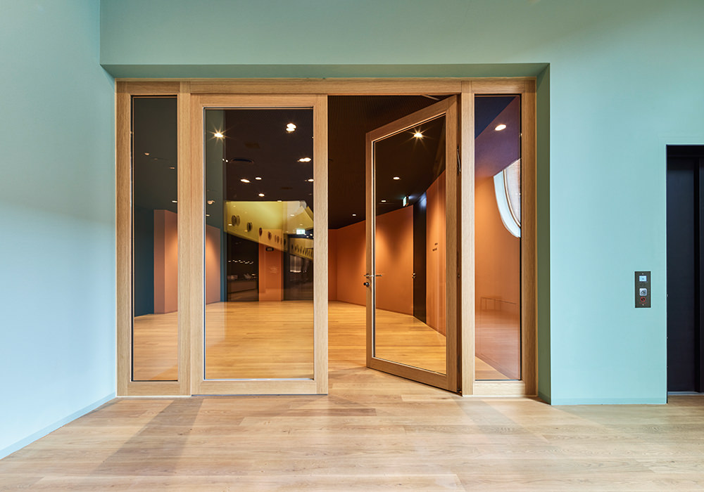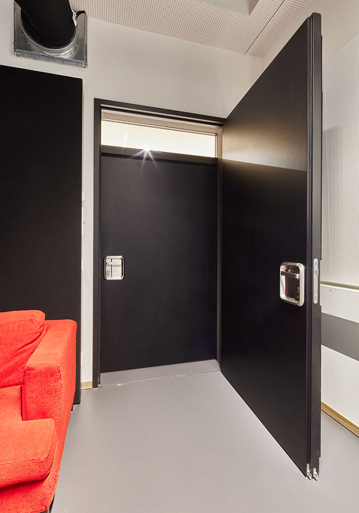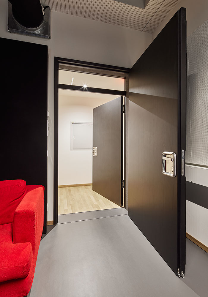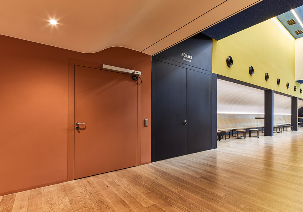 Wie wichtig die Gestaltung von Türen für ein herausragendes Projekt ist, kann exemplarisch am Volkstheater München festgemacht werden. Für das Projekt ließen die Architekten von LRO eine spezielle Türblattoberfläche erstellen und bemustern. Ergebnis sind Spezialtüren, die mit einem Echtholzfurnier aus Seekiefer zur Ausführung kamen. Die Oberfläche wurde nicht „naturbelassen“, sondern gebeizt und klar lackiert. Einige Türen entsprechen allerdings nicht diesem Bild: So gibt es Brandschutz-Massivholzrahmentüren mit einem großen Glasanteil sowohl im Türblatt als auch in den feststehenden Seitenteilen. Eine weitere Besonderheit sind zwei Doppeltüranlagen, mit der man hohe Schalldämmwerte von bis zu 60 Dezibel erreicht. Hier übernimmt eine dieser Anlagen zum Beispiel die Schallisolierung des Tonstudios mit bis zu 55 Dezibel. Es kamen teilweise sehr breite und hohe Türen zum Einsatz, beispielsweise eine zweiflügelige T90 Tür mit knapp 4 Metern Höhe. Viele Türen wurden zudem mit hochwertiger Technik ausgestattet: So erleichtern Motor- und Panikschlösser die Bedienung, Zugangskontrollen sorgen für Sicherheit im laufenden Betrieb.