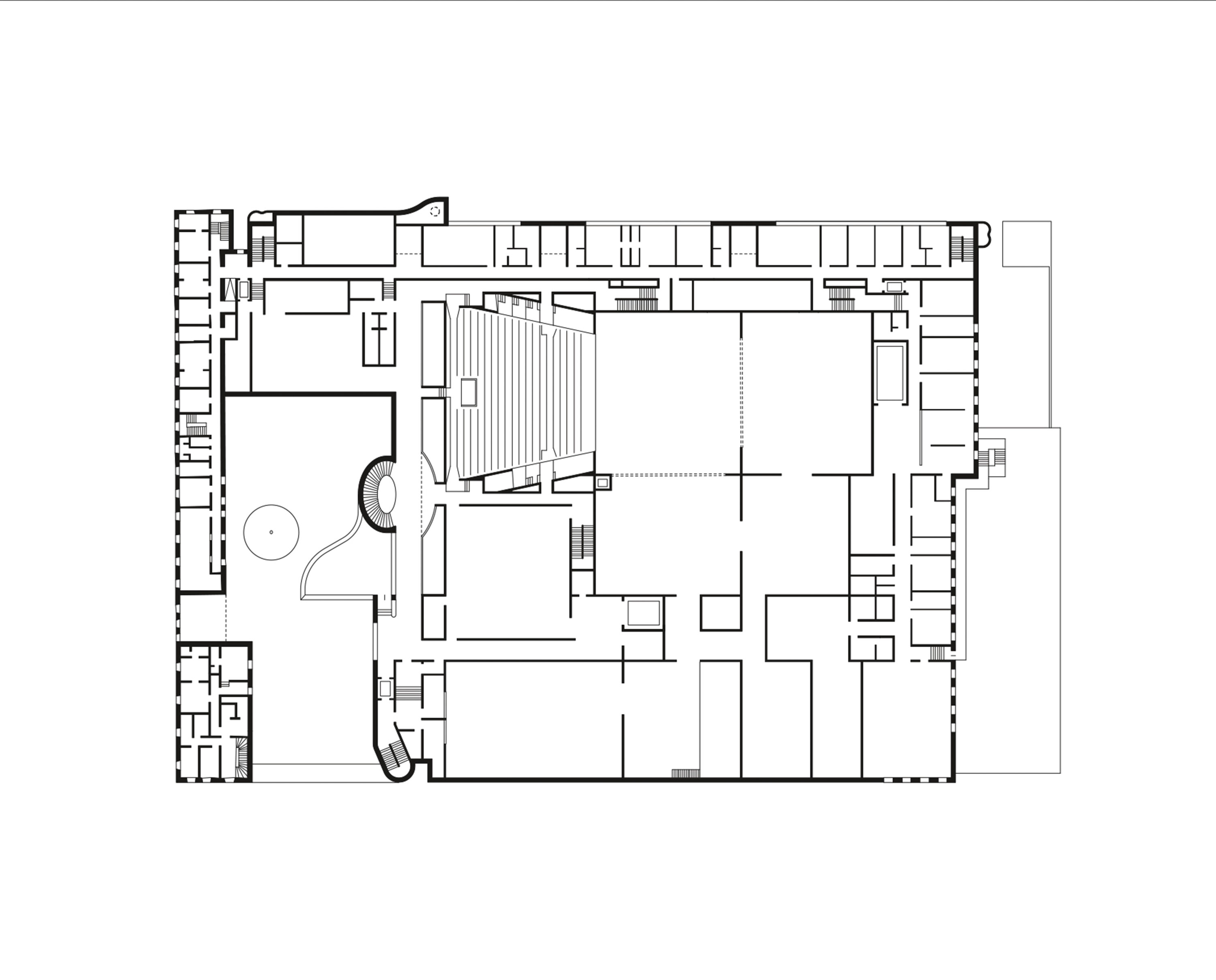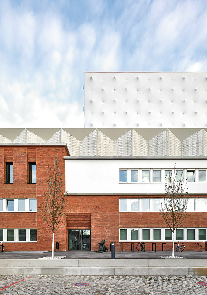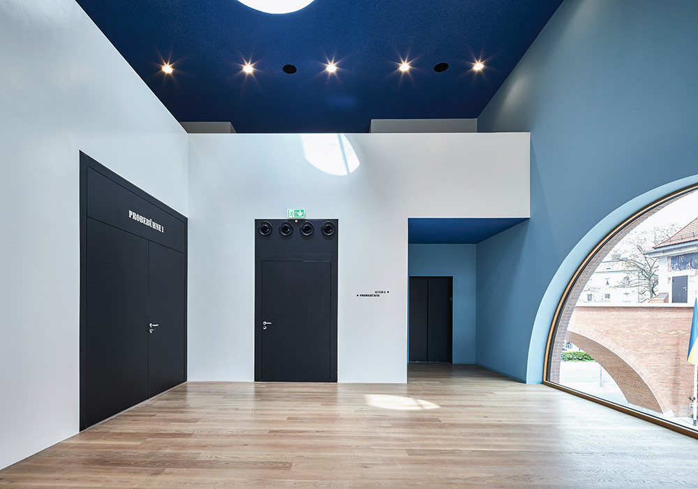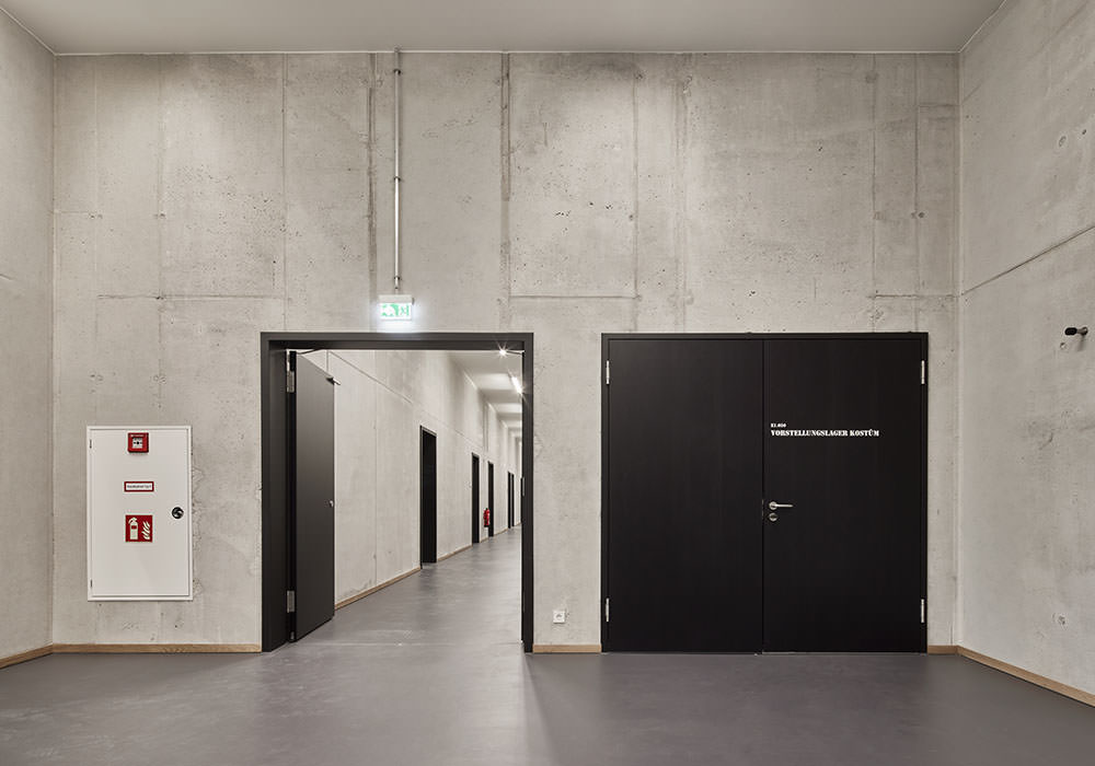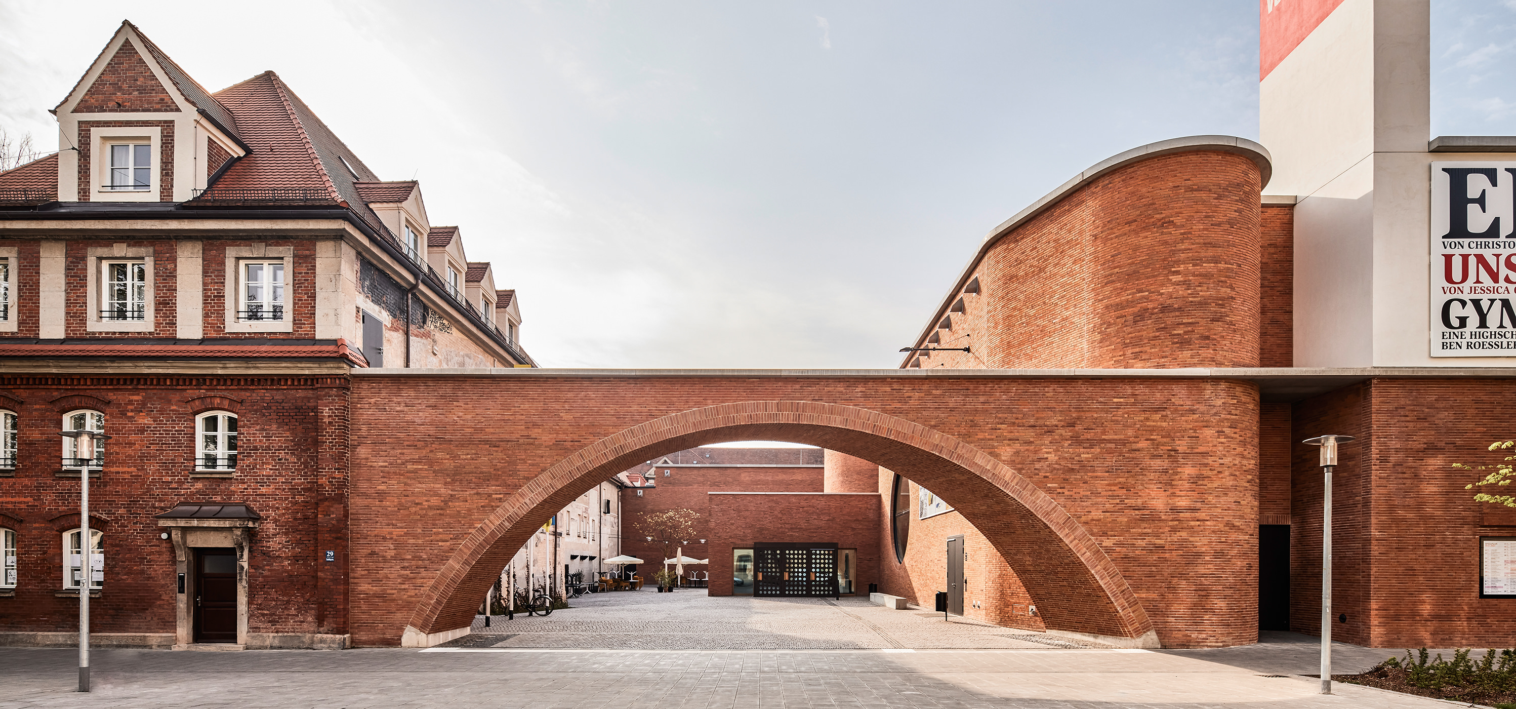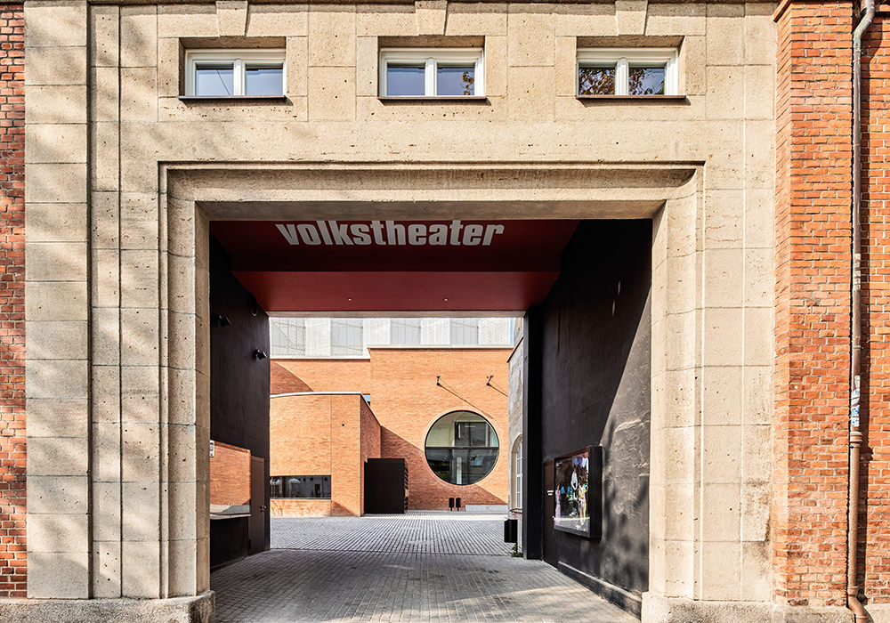 Inmitten des Schlachthausviertels entstand ein Theater für jene, die das Theater machen, denn der weitaus größte Teil eines solchen Bauwerks befindet sich hinter den drei Bühnen. Und es entstand ein Theater für jene, die es besuchen und lieben. Es entstand ein integrales Bauwerk, das denkmalgeschützte Teile des Viehhofs und die heterogene Bebauung des Umfelds miteinander versöhnt. Vor allem jedoch entstand ein Kulturgebäude, das ohne die Attitüde der Hochkultur auskommt, keinerlei Schwellenängste aufkommen lässt und dennoch ein richtiges Theater sein will. Für das Ensemble war es ein gewaltiger Schritt heraus aus der bislang genutzten Mehrzweckhalle in der Brienner Straße. Und wer sich dem neuen Volkstheater erstmals nähert, der fühlt sich spontan an die Berliner Schaubühne am Lehniner Platz, erinnert, die von Erich Mendelsohn ursprünglich als Kino und damit als Palast der Populärkultur entworfen wurde. Dass die denkmalgeschützten Schlachthäuser in Ziegel ausgeführt wurden, ist ein Glücksfall. Ermöglichten sie es den Architekten von LRO Lederer Ragnarsdóttir Oei doch, auch hier eines ihrer bevorzugten Materialien einzusetzen und das Quartier materialidentisch zu komplettieren. LRO fügten das Theaterquartier an einen alten Verwaltungstrakt des Schlachthofs an und schufen dahinter einen Innenhof zur gemeinsamen Erschließung des Theatercafés und des Foyers. Ein gewaltiger, flach überwölbter Torbogen aus Ziegeln funktioniert als perfekte Willkommensgeste und führt die Besucher von der Straße direkt zum Haupteingang. Es ist eine Übergangszone aus dem öffentlichen Raum ins Halbdunkel des Theaters.