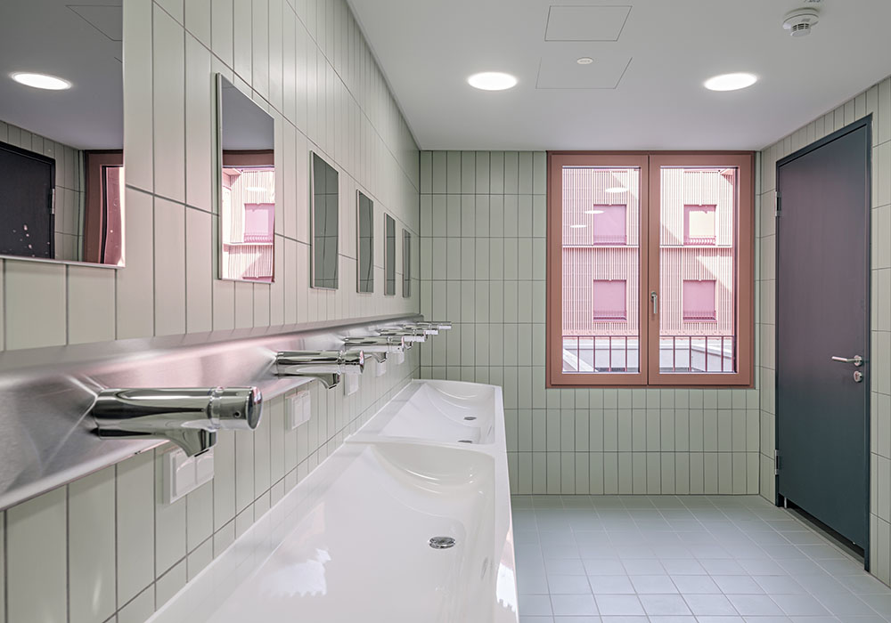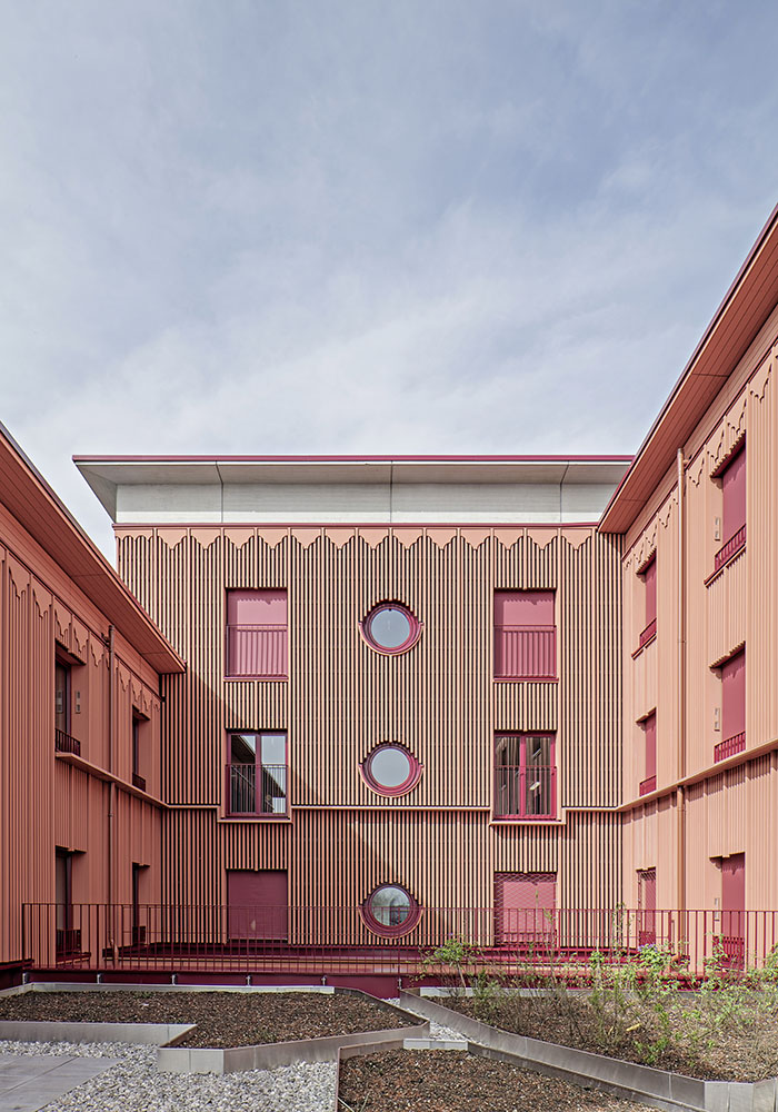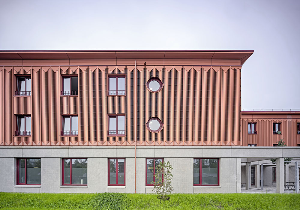 Dass es auch hier um Kostensenkung und Tempo gehen musste, ist fraglos. Auf dem Sockel aus Betonfertigteilen sitzen nun vorgefertigte, ziegelrot gestrichene Holzrahmenelemente. Das Besondere daran (und für Hild und K keineswegs ungewöhnlich) ist die entspannt dekorative Gestaltung dieser Fassaden mit simplen, vertikalen Leisten und rhythmisierten Endungen.