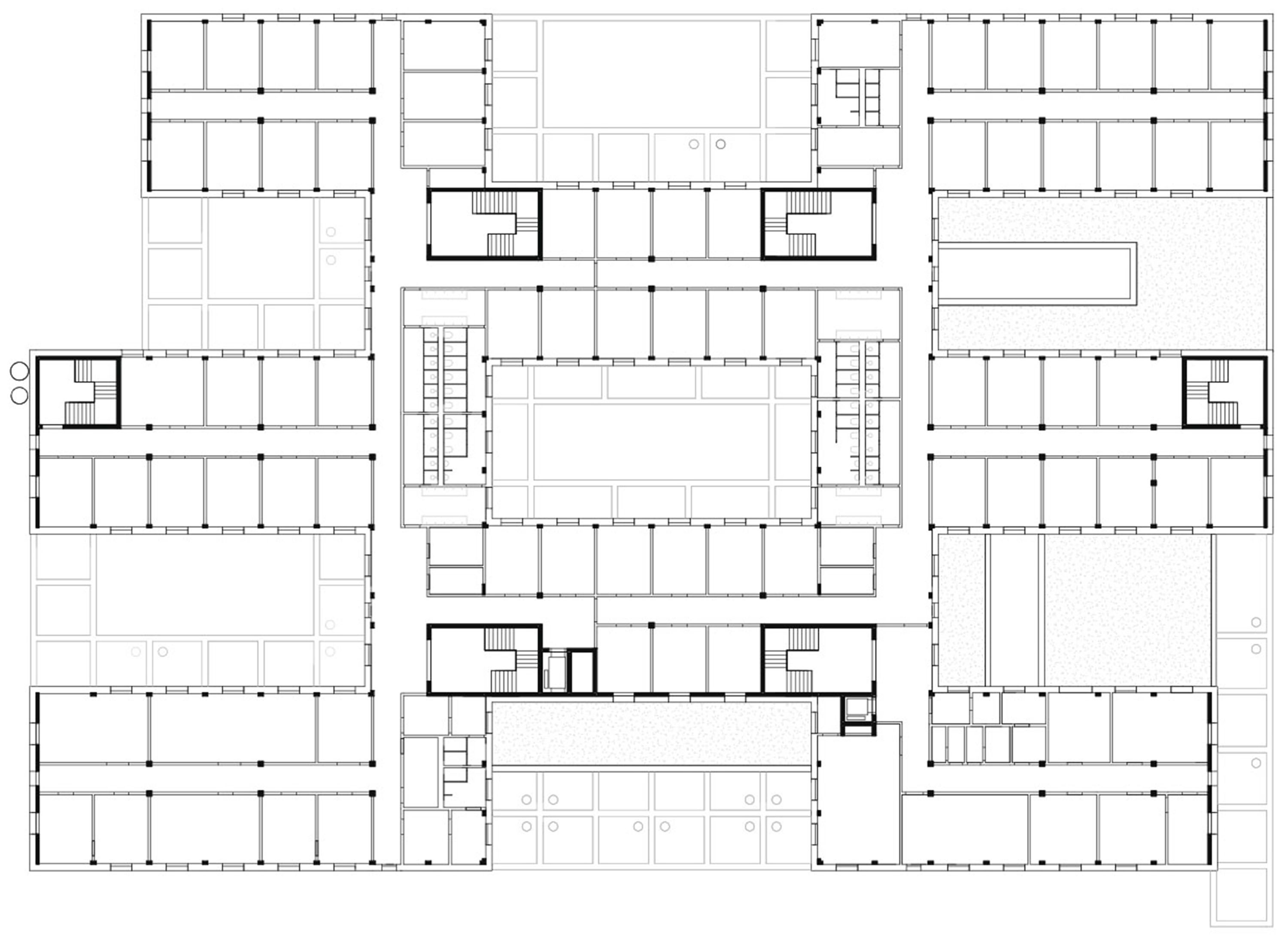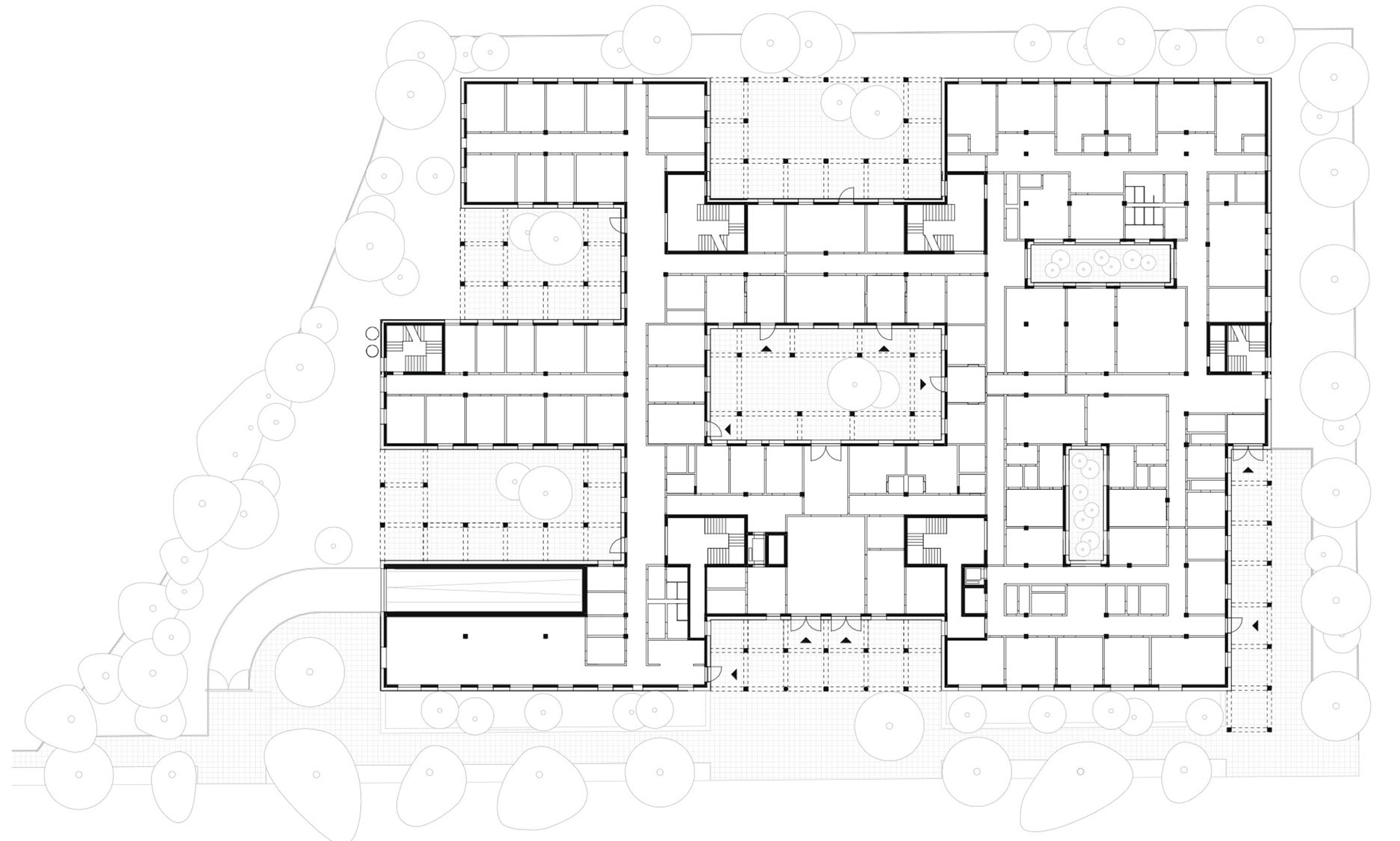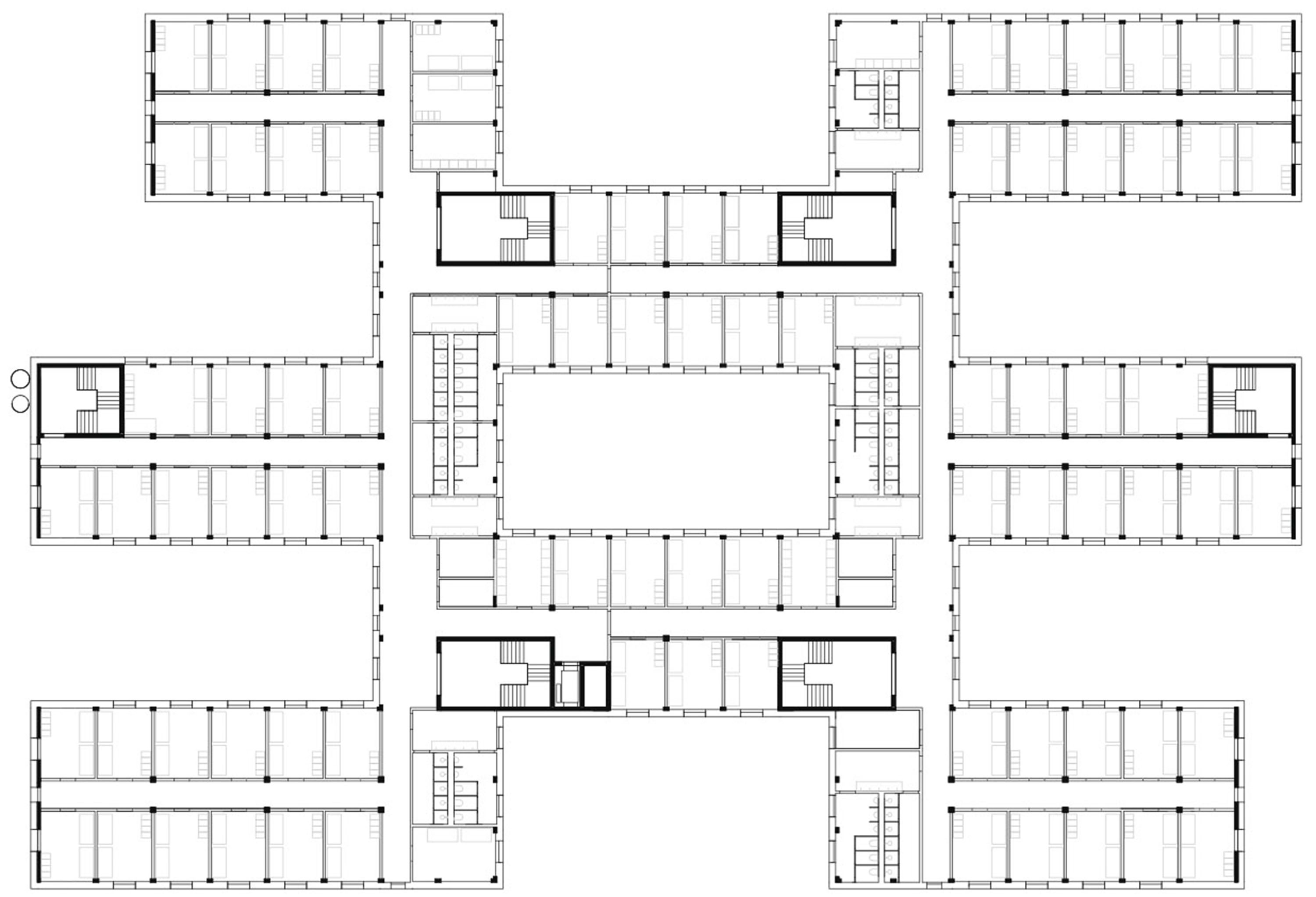 Typologisch lehnt sich das Projekt an ein Männerwohnheim Theodor Fischers an – architektonischer Übervater des beginnenden 20. Jahrhunderts und Vorläufer der „Stuttgarter Schule“. Intime Innenhöfe bieten hier Sichtschutz, und die Straßenseite mit einem angedeuteten „Ehrenhof“ schafft eine Empfangsgeste, die der überwiegenden Anzahl der Gäste wohl selten geboten wird.