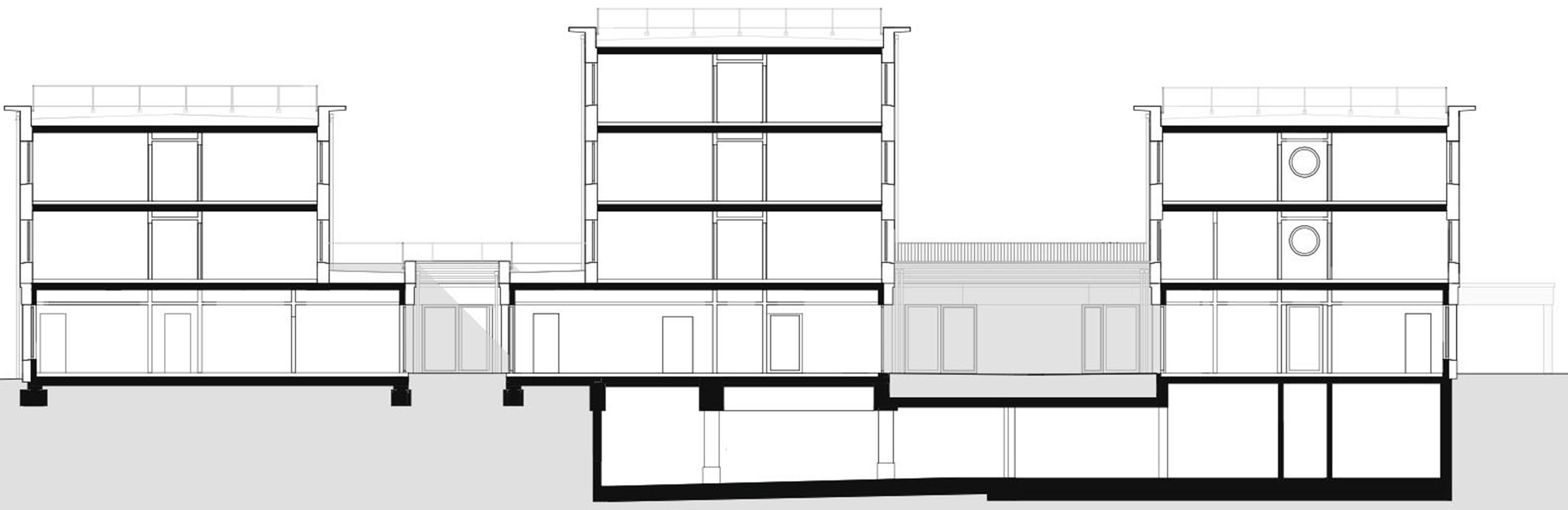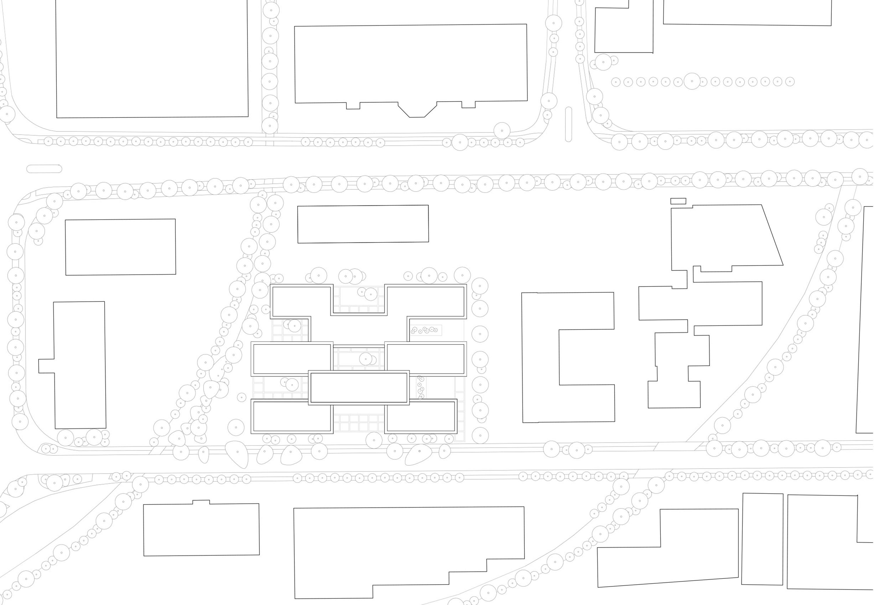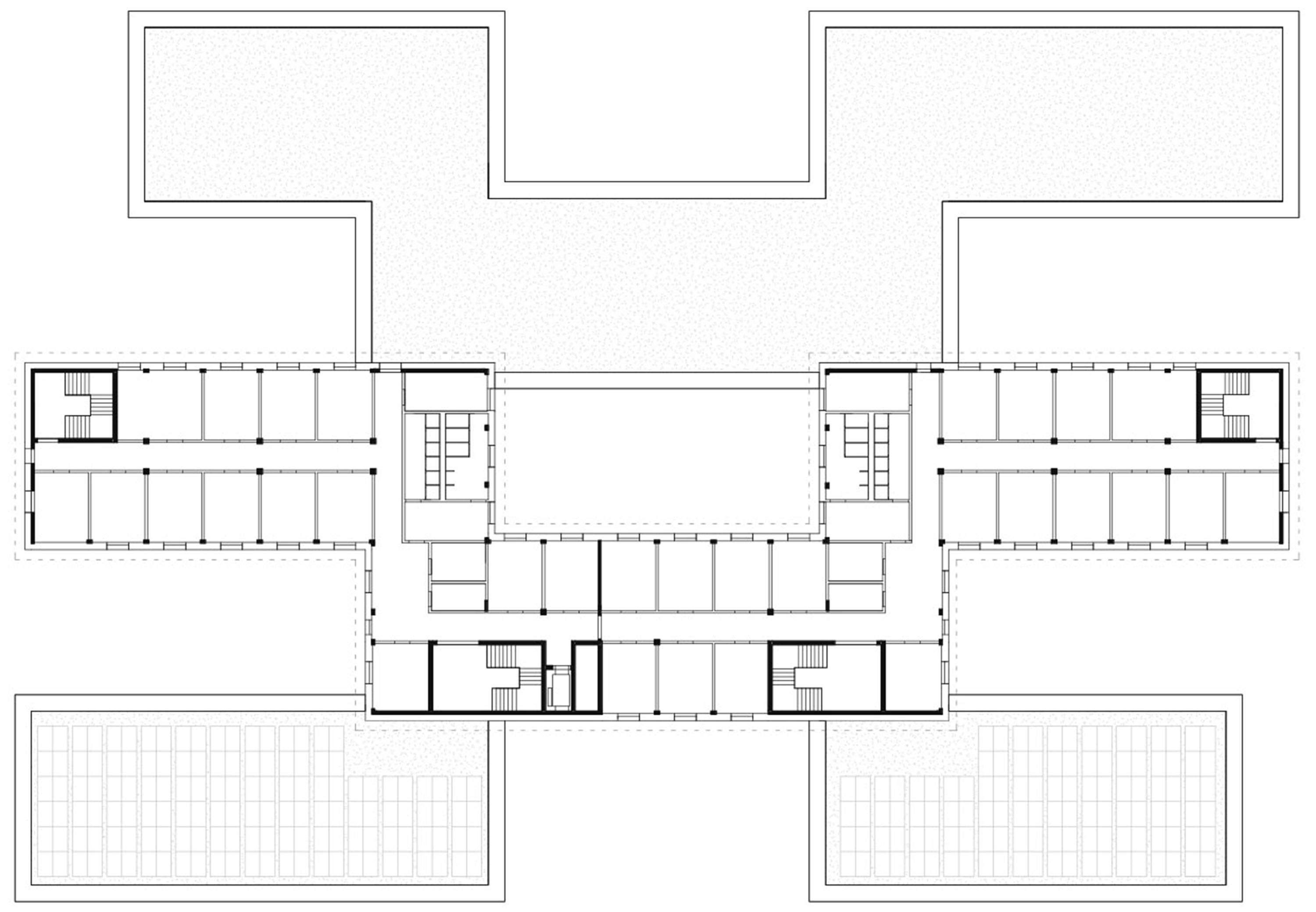 Typologisch lehnt sich das Projekt an ein Männerwohnheim Theodor Fischers an – architektonischer Übervater des beginnenden 20. Jahrhunderts und Vorläufer der „Stuttgarter Schule“. Intime Innenhöfe bieten hier Sichtschutz, und die Straßenseite mit einem angedeuteten „Ehrenhof“ schafft eine Empfangsgeste, die der überwiegenden Anzahl der Gäste wohl selten geboten wird.