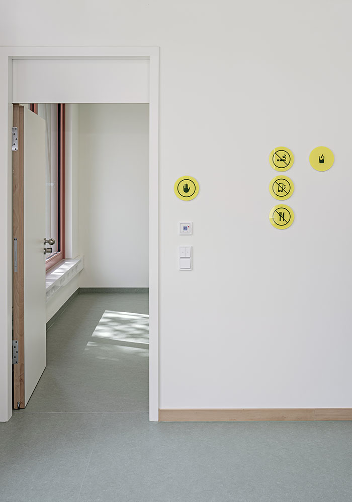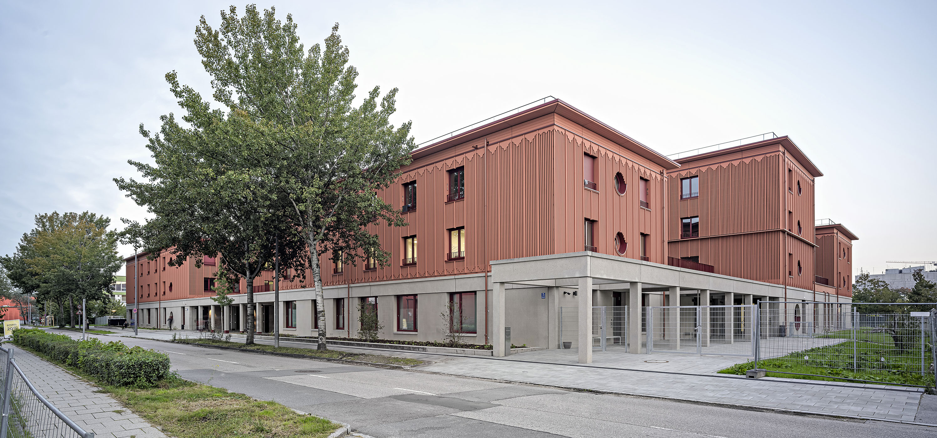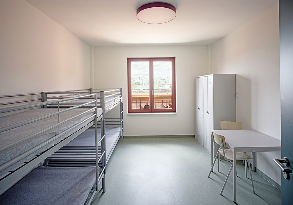 Auch in München steht die Einrichtung in einem städtebaulich disparaten Gewerbegebiet – und sticht deshalb ganz besonders heftig heraus aus dem Vielerlei der Belanglosigkeiten. Auf den ersten Blick wird klar: Die Gäste werden nicht nur aus dem Stadtbild entfernt und irgendwie „untergebracht“. Sie werden empfangen, bei Bedarf medizinisch erstversorgt, und es werden auch psychosoziale Beratungen für scheinbar ausweglose Situationen angeboten. 730 Plätze in 4-Bett-Zimmern bieten jenen Schutz, den es auf der Straße nicht gibt. Männer, Frauen und Familien werden getrennt untergebracht. Ein Sicherheitskonzept soll Übergriffe und Diebstähle verhindern. Gestalterisch ist das Bauwerk ein Beweis dafür, dass die Gäste Menschenwürde und Respekt verdient haben.