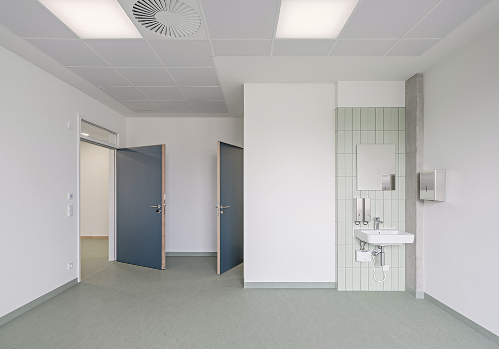 Wer im Übernachtungsschutz die Nacht verbringt, ist tatsächlich schutzbedürftig. Hierher kommt man, wenn man keine andere Möglichkeit hat, eine Nacht in Sicherheit zu verbringen: Ein Übernachtungsschutz dient Menschen in misslicher Lage, Menschen ohne Wohnraum, die ohne dieses Projekt auf der Straße leben müssten. Die meisten tun das nicht ohne Grund, psychische Probleme sind oft die Ursache für ihre Lage. Umso wichtiger, dass sie sich in einer Einrichtung wie dieser wohlfühlen. Dazu trägt eine „beruhigende“ Gestaltung bei. Türen nehmen hierbei eine wichtige Rolle ein. Sie könnten den Bewohnern schnell das Gefühl vermitteln, eingesperrt zu sein. Das ist hier nicht der Fall. Neben der ruhigen Farbgebung – es wurde eine HPL-Beschichtung im RAL-Ton Petrol oder Avocado gewählt – verfügen viele der Türen über Panikschlösser. Sie geben die Möglichkeit, dass Türen zwar von außen verschlossen werden, aber gleichzeitig ohne Schlüssel von innen zu öffnen sind. Auch Fluchttüröffner tragen zum Gefühl der Sicherheit bei. Sie sorgen dafür, dass sich die Falle selbst bei Panik und unkontrolliert ausgeübtem Druck auf die Schließplatte leicht öffnet und nicht verkeilt.