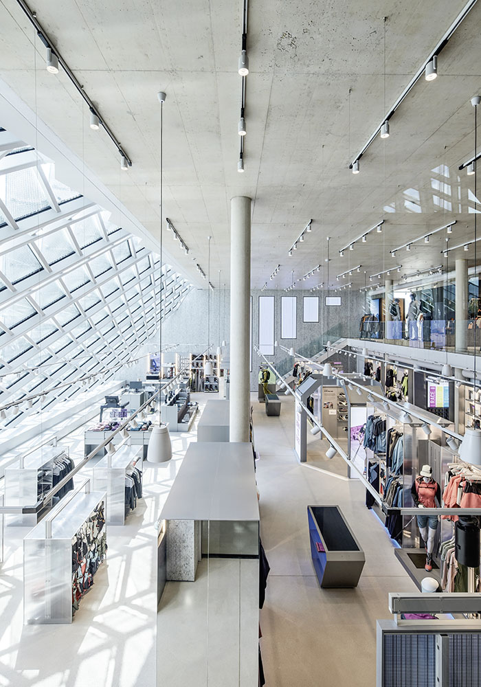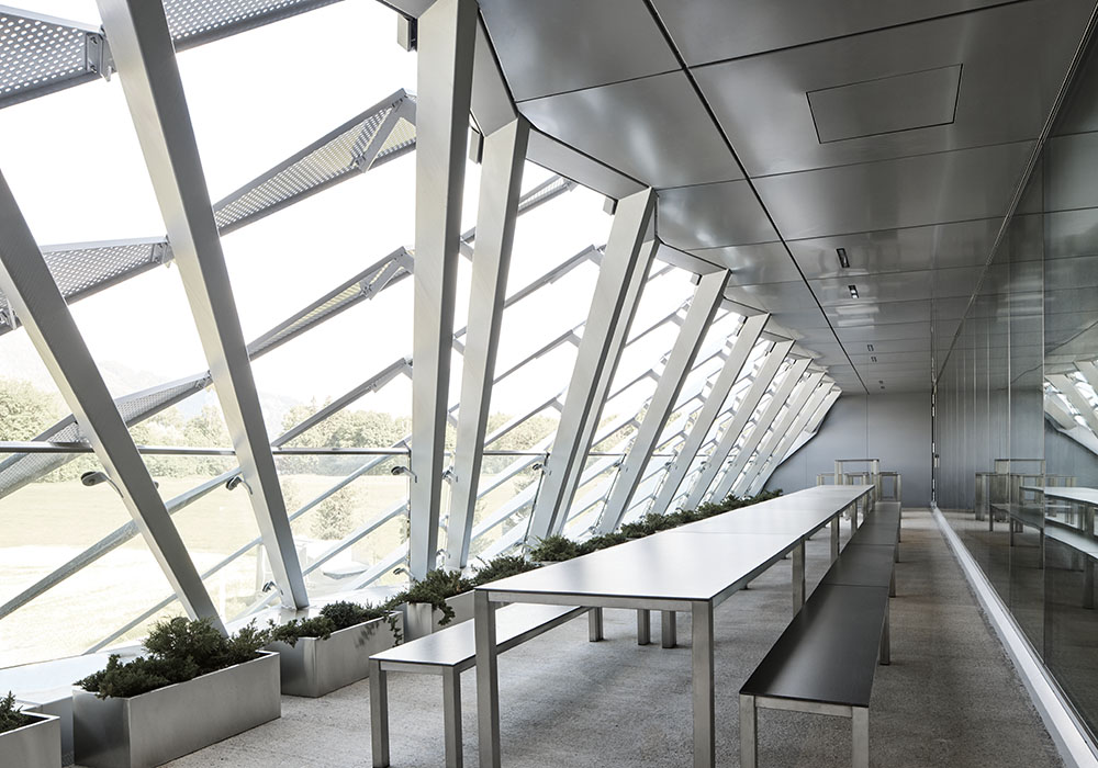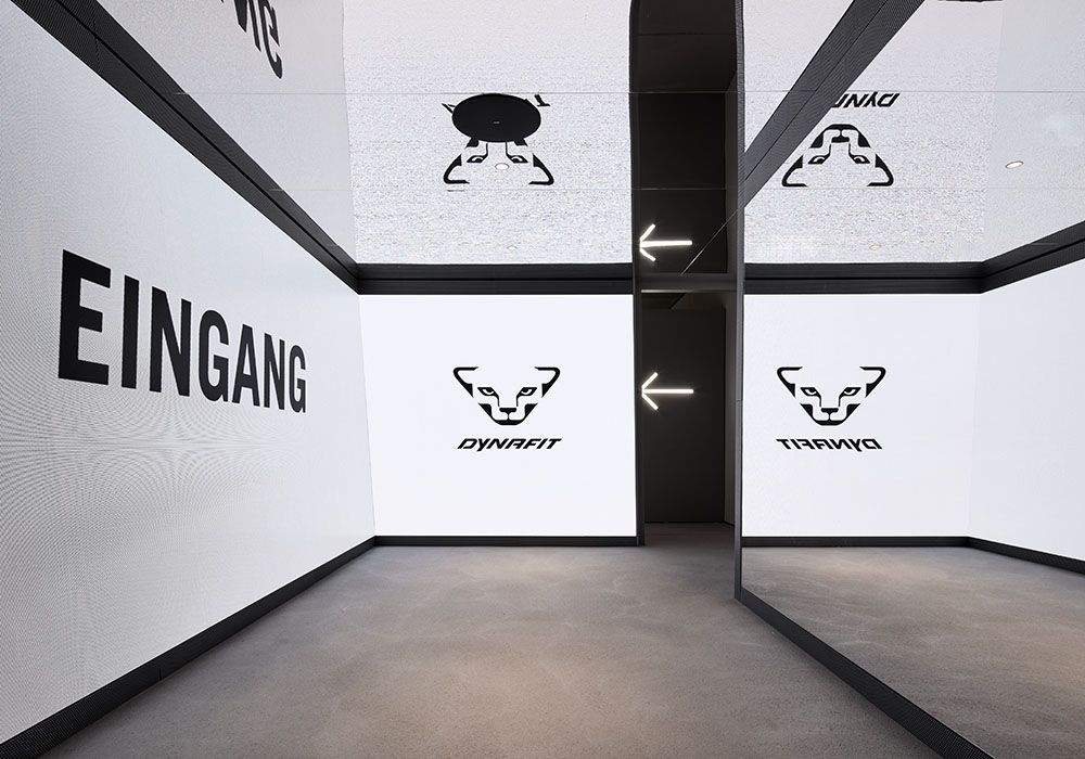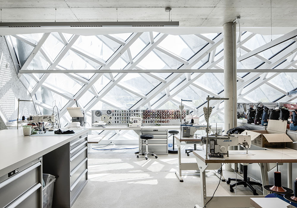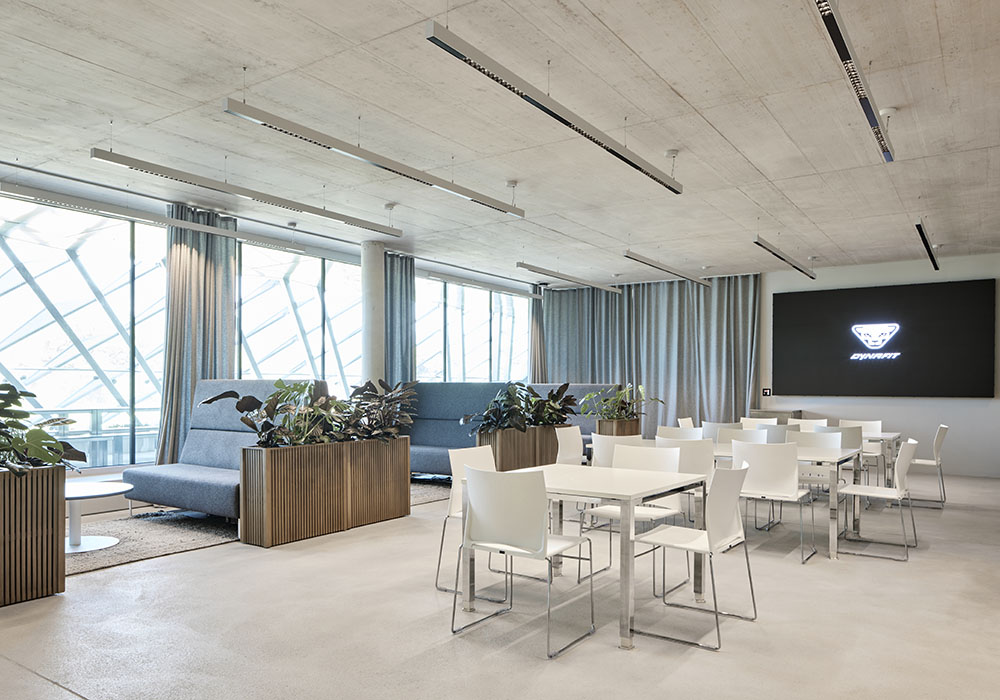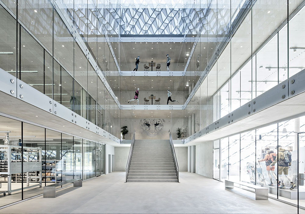 Die Außenhaut der Dynafit-Pyramiden aus kristallin erscheinenden und als Sonnenschutz wirkenden Metallschuppen erinnert an Gletscher. Im Inneren wurde auf alles verzichtet, was nicht der Leistung des Gebäudes entspricht. Sichtbeton, Glas und blankes Metall, sonst gibt es nichts – und es passt damit zur Markenbotschaft des Unternehmens, das der Kundschaft mit „effizienten Systemen“ aus Schuhen, Bindungen, Skiern und Kleidung zu maximaler sportlicher Leistung verhelfen will.