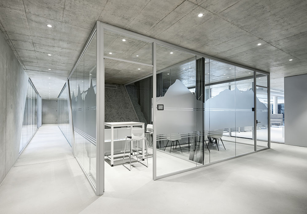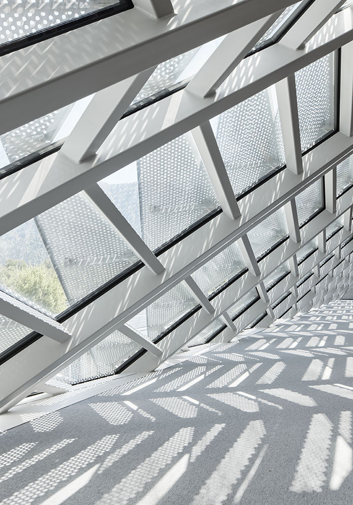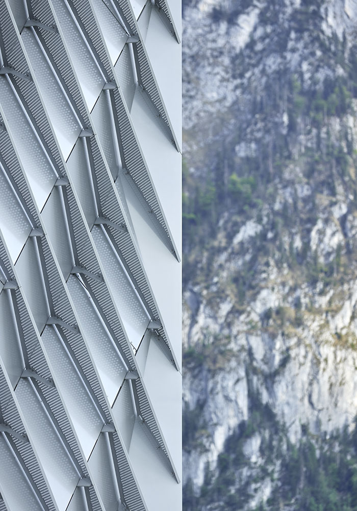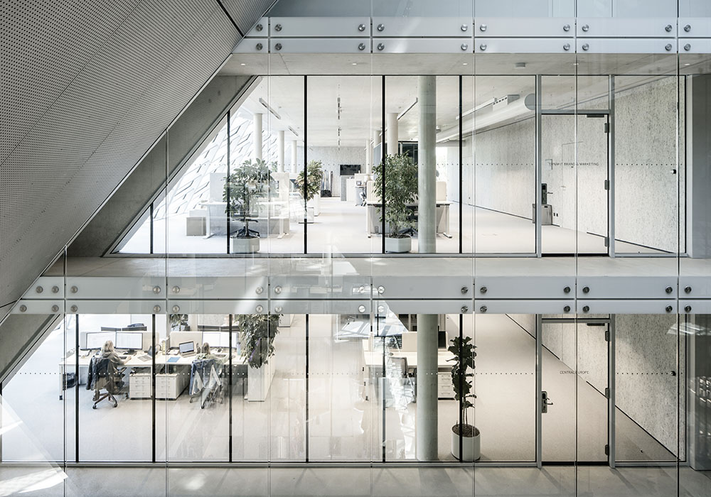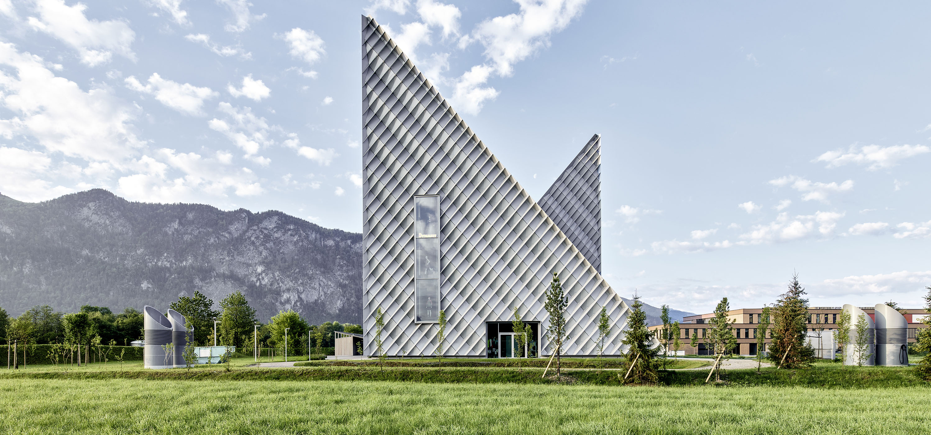 Die Außenhaut der Dynafit-Pyramiden aus kristallin erscheinenden und als Sonnenschutz wirkenden Metallschuppen erinnert an Gletscher. Im Inneren wurde auf alles verzichtet, was nicht der Leistung des Gebäudes entspricht. Sichtbeton, Glas und blankes Metall, sonst gibt es nichts – und es passt damit zur Markenbotschaft des Unternehmens, das der Kundschaft mit „effizienten Systemen“ aus Schuhen, Bindungen, Skiern und Kleidung zu maximaler sportlicher Leistung verhelfen will.