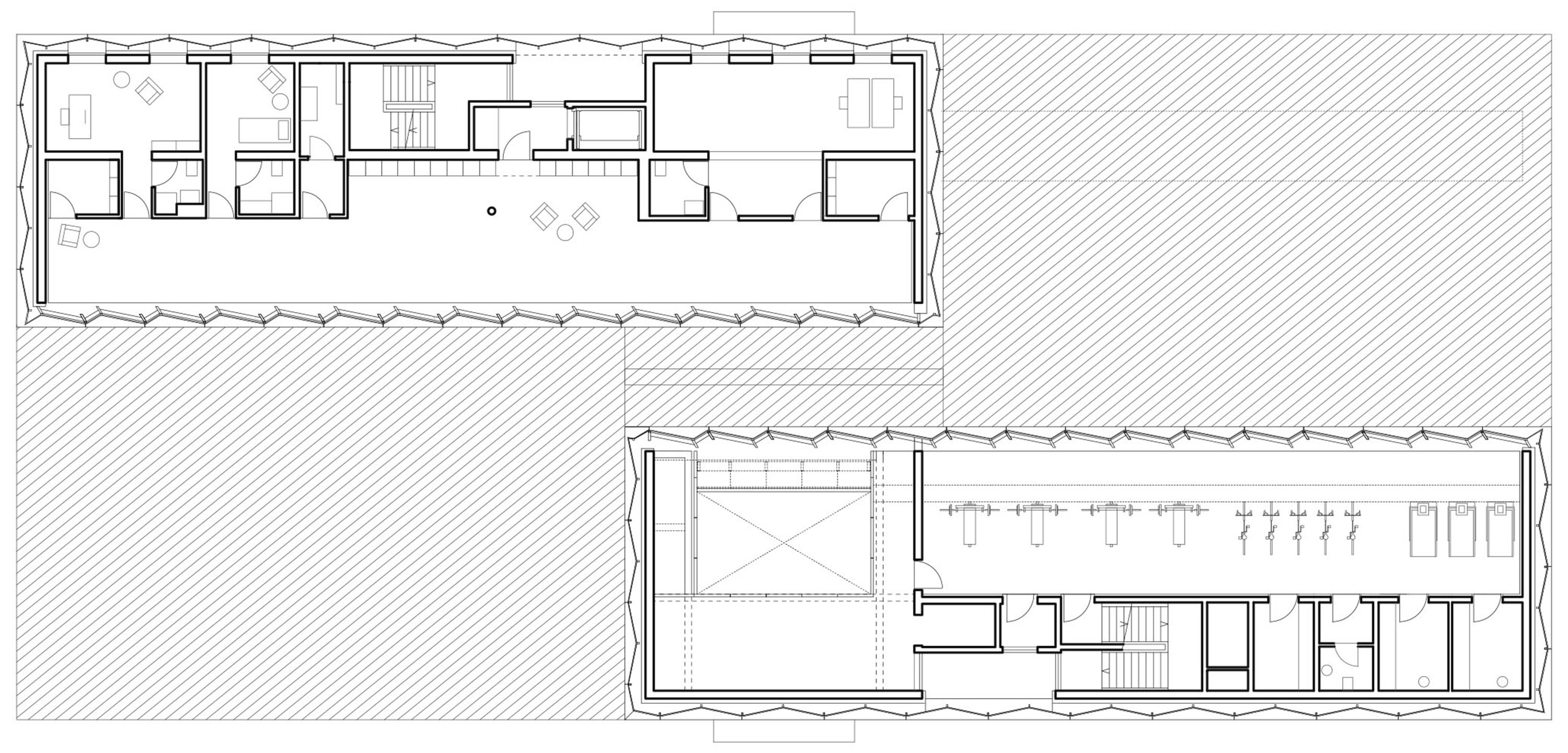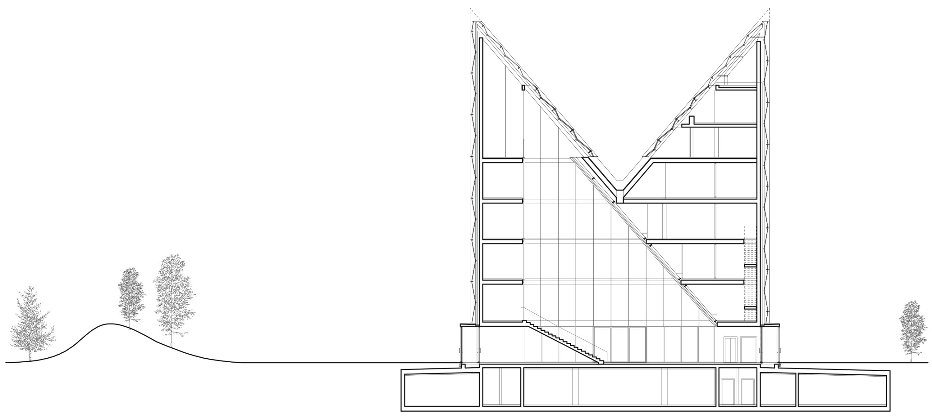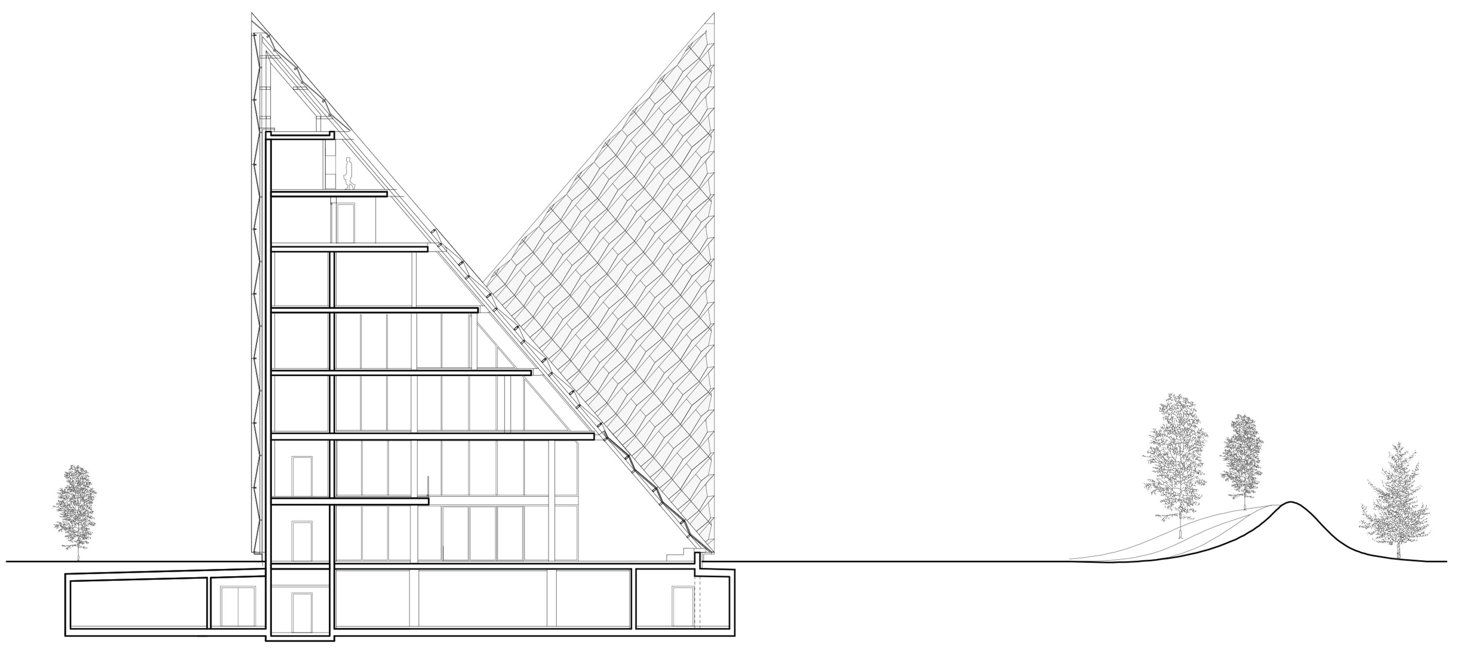 Die vom Architekturbüro mit dem Adjektiv „pyramidal“ benannten Baukörper setzen die alpine Landschaft zwischen Mangfall und Wildem Kaiser baulich fort. Dass keine drei Kilometer entfernt die fast 2000 Meter hohe Pyramidenspitze in den Himmel ragt, mag Zufall sein – aber es passt. Tatsächlich sind es bei Dynafit zwei rechtwinklige Dreiecke, die gegeneinander gesetzt sind und deren Verschneidung die Eingangshalle bildet. Vielfältige Sichtbeziehungen eröffnen den Gästen Einblicke in den Shop und die Werkstätten des Herstellers.