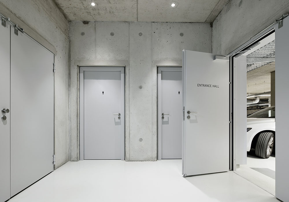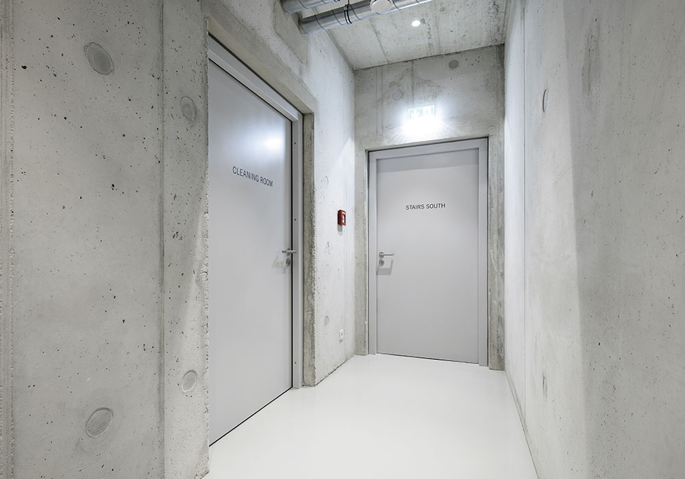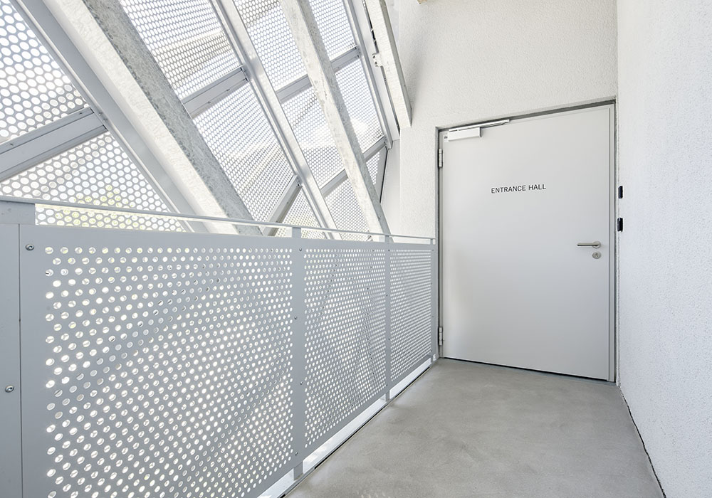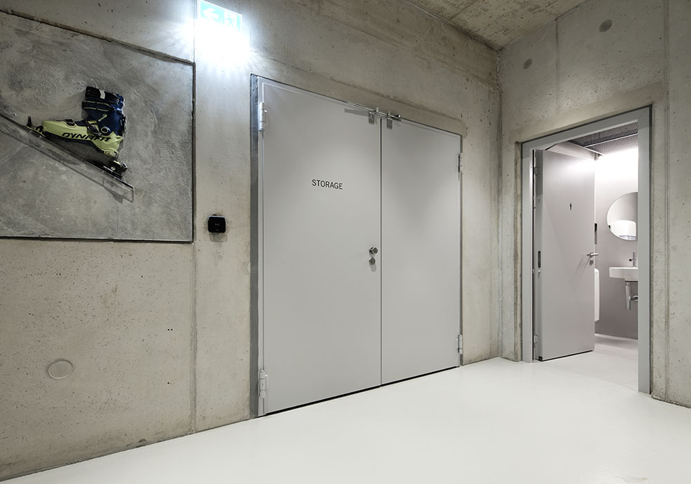 Stahl-Objekttüren sieht man eher selten als Teil architektonischer Gestaltung. Zumeist fügen sie sich so unauffällig – oder im Gegenteil – so kontrastreich wie möglich dort ein, wo sie notwendig sind. Anders beim Hauptquartier des Sportartikel-Ausrüsters Dynafit. Hier führen sie als Fluchttüren in eine Art Laubengang hinter der geometrischen Fassade. Dort, wo je nach Lichteinfall die Schatten der Fassadenkonstruktion als ornamental-grafisches Muster auf die Wände fallen, sind die Stahl-Objekttüren farbgleich zur Wand eingelassen. Dadurch bilden sie eine Art Leinwand, auf der sich die Struktur der Fassade widerspiegelt. Einen leichten Kontrast bilden hingegen die Türen im Untergeschoss. Dort heben sie sich dezent von den Wänden aus Beton ab. Neben ihrer Funktion als Brandabschnittstür dienen sie in dieser Umgebung auch als Zugang zu den Nassräumen. Das sorgt für ein einheitliches Gesamtbild in den Verkehrsflächen. Ein weiterer Vorteil ist ihre Robustheit. Sie lassen sich leicht reinigen und sind widerstandsfähig gegen aggressive Putzmittel.