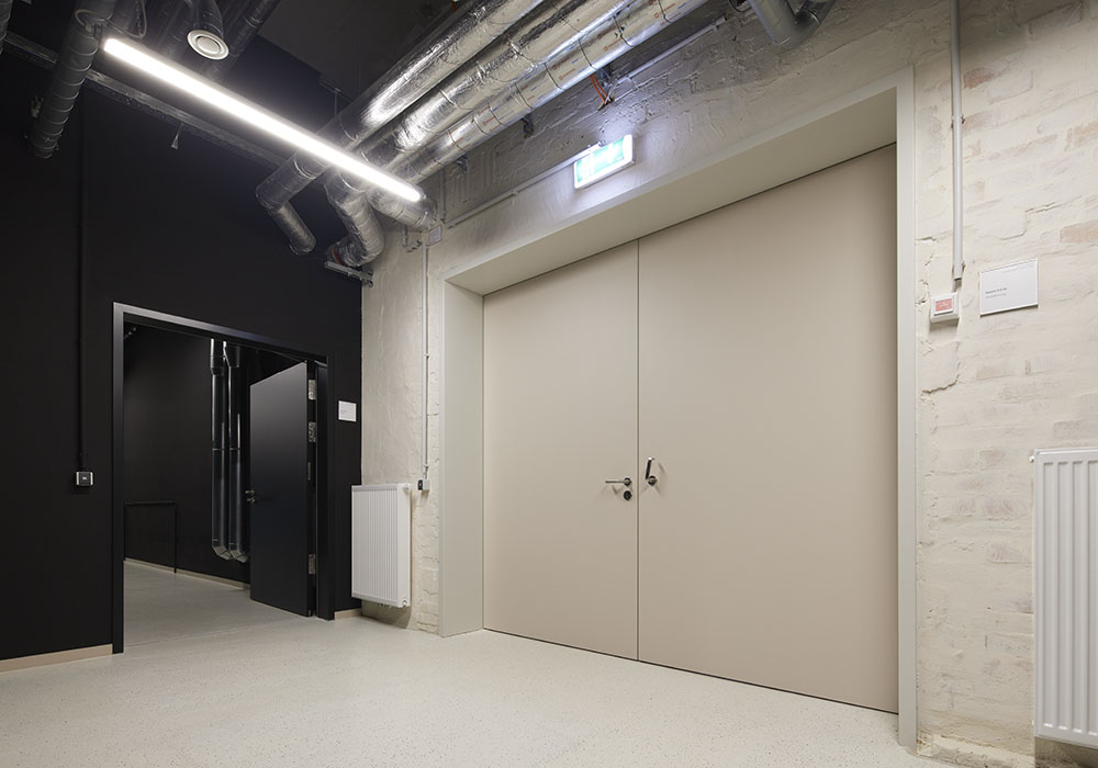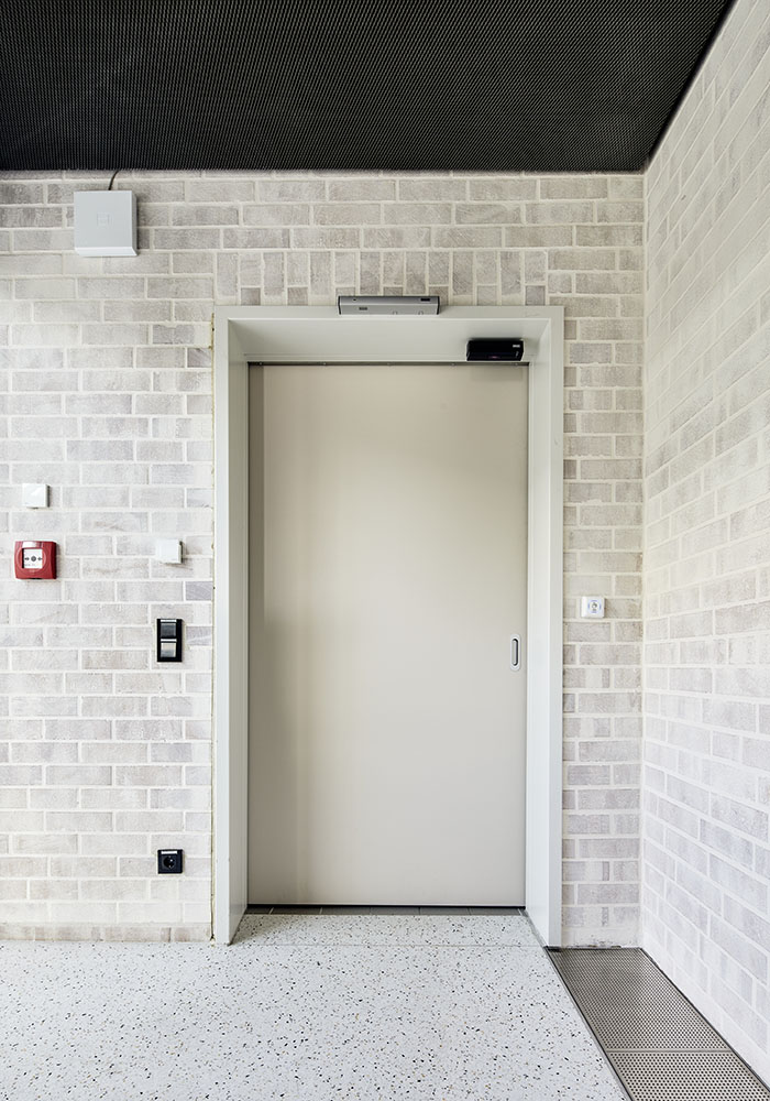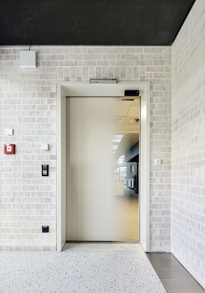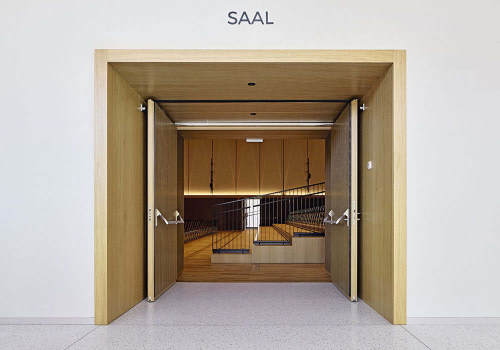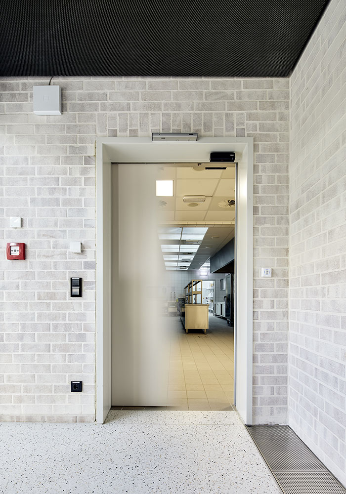 Rundbögen über Türen sieht man meist nur in historischen Bestandsbauten. Spätestens seit es Beton gibt, sind sie obsolet. Allerdings verleihen diese Bögen dem Bau Charakter. Geht man mit offenen Augen durch die Welt, fällt leider auf, dass allzu viele Bauherren den einfachen Weg gehen, die Rundung verblenden und darunter gewöhnliche, rechteckige Türen einbauen. Habermann Architektur weiß Rundbögen zum Glück zu schätzen und ließ die Türen entsprechend mit rundem Türblatt von Schörghuber herstellen. Vielleicht nur ein kleines Detail in der Architektur, aber ein bezeichnendes. Weitaus funktionaler sind die automatischen Schiebetüren, die in diesem Projekt vorkommen. Zwischen Küche und Gastraum sorgen sie dafür, dass Personal auch mit vollen Händen schnell den Raum wechseln kann. Schiebetüren sind mit einer ganzen Vielfalt von Funktionen ausstattbar. In Finsterwalde ist eine zum Beispiel als T30 Brandschutztür ausgeführt. Auch Schall- und Strahlenschutz sind möglich, aber in diesem Kontext natürlich nicht notwendig. Apropos Schallschutz: Auch hier ist Schörghuber ein Experte und liefert die doppelflügeligen Schallschutztüren, die zum Konzertsaal führen.