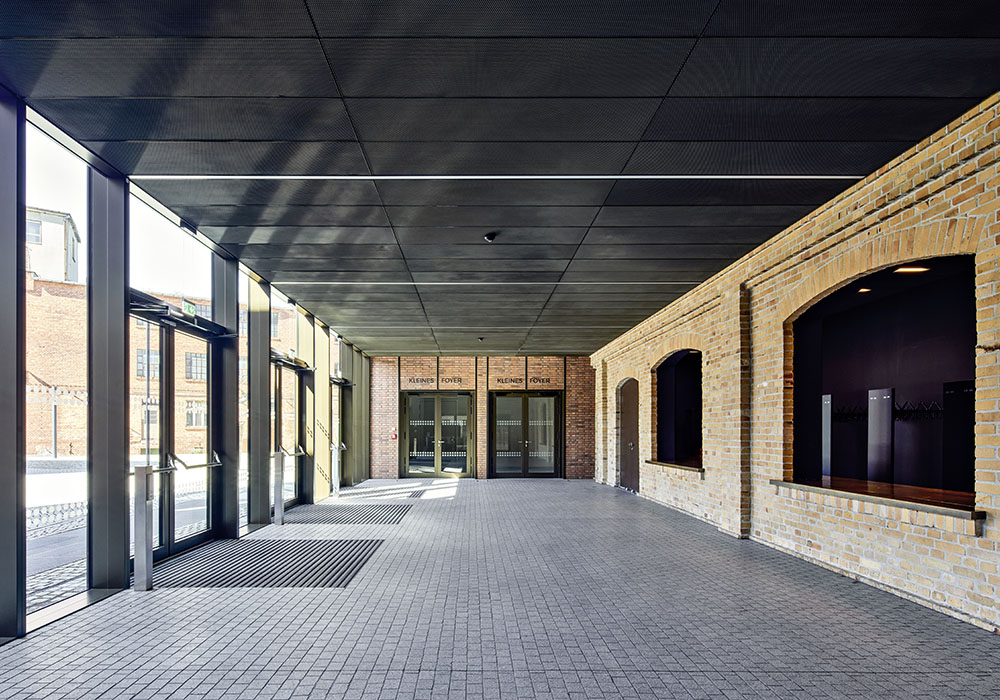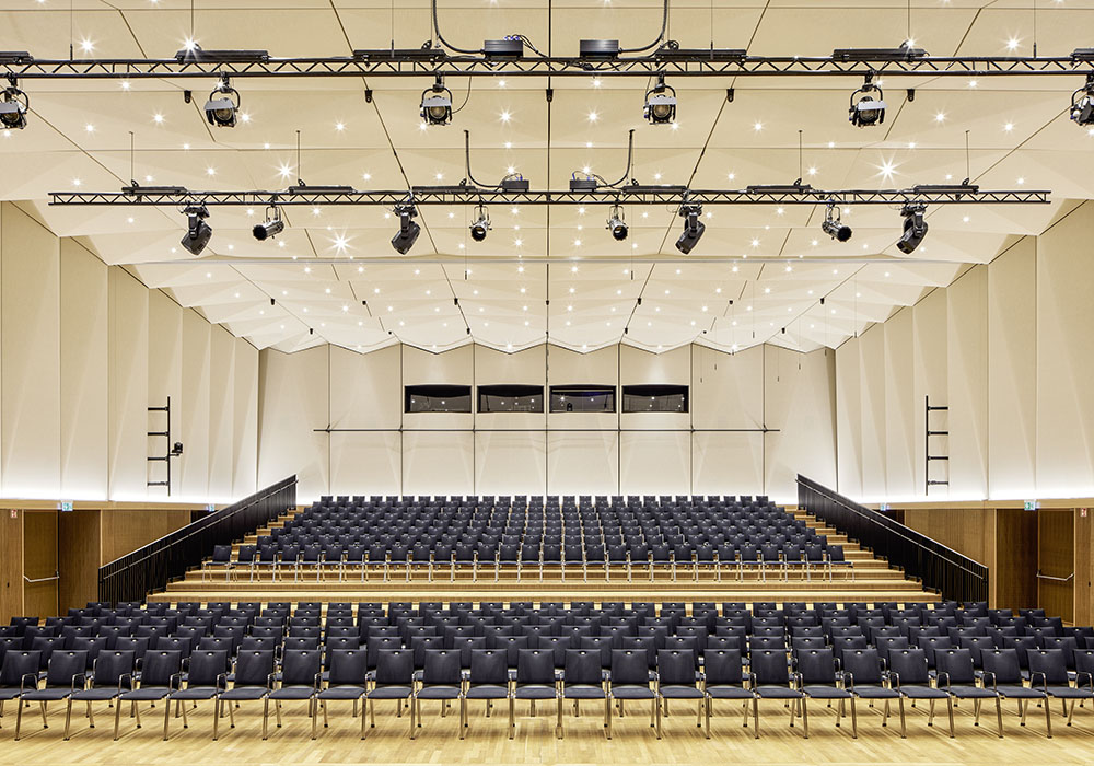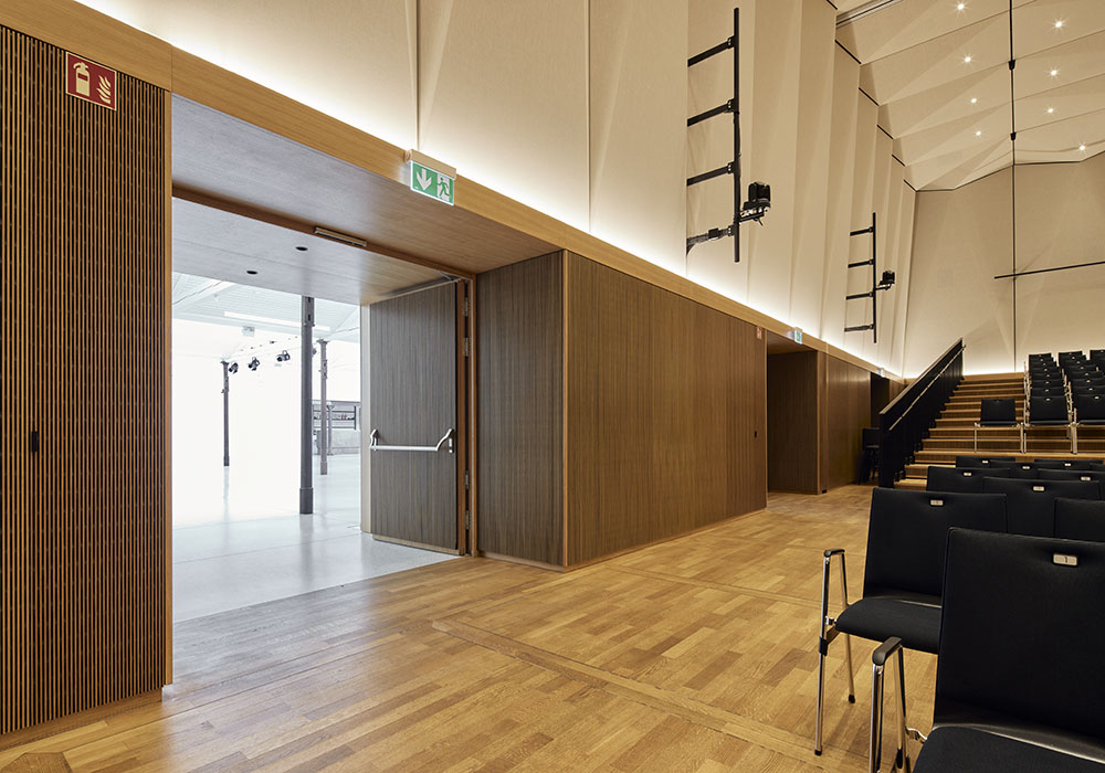 Möglich wird dies durch ein System zur Verlängerung von Nachhallzeiten. Damit lässt sich die Halle den unterschiedlichen Anforderungen anpassen. Die mit Leinen bespannten Akustikelemente mit ihrer Faltung und textilen Anmutung passen perfekt zum Ort – denn schließlich wurden hier ja Textilien gewoben.