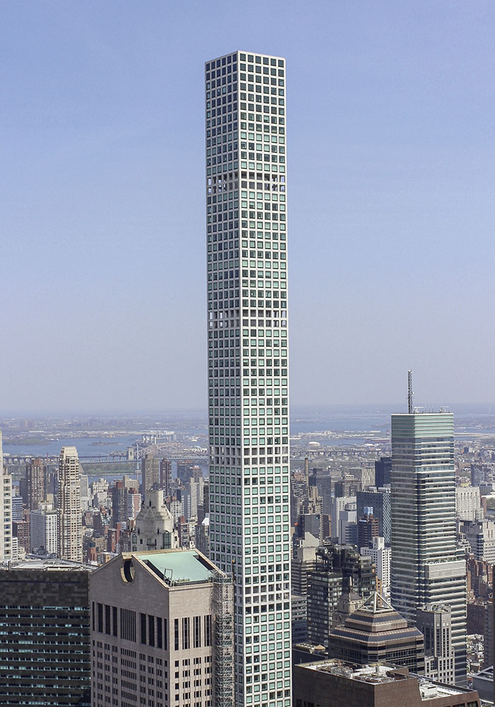 Schließlich muss ein weiteres absurdes Ende der Hochhausarchitekturentwicklung beleuchtet werden: der Bau der Bleistifthäuser in Manhattan, was auch nur in Manhattan, New York City, möglich ist. Denn nur dort können Immobilien die enormen Baukosten, bedingt durch die extremen Baukonstruktionen, wieder beim Verkauf der Wohnungen einholen. Diese ultradünnen Türme bestechen aufgrund ihrer unmöglich erscheinenden Schlankheit. In der Statik im Studium haben wir gelernt, dass eine Schlankheit von mehr als 12:1 physikalisch nicht möglich ist. Der schönste und markanteste Bleistift ist ganz klar 432 Park Avenue von Viñoly Architects. Er hat einen Schlankheitsfaktor von 15:1 bei einer Höhe von 426 Metern und wurde 2011 fertiggestellt. In der Umgebung der Billionaires‘ Row gibt es allerdings einen Bleistift, der ihn noch übertrifft. Der „thinnest skyscraper in the world“ ist der 111 West 57th Street oder auch Steinway Tower (2022) von SHoP Architects. Er misst 24:1 – bei einer Höhe von 435 Metern entspricht das einer Breite von nur 18 Metern! Die Wettbewerbsspirale erfährt derzeit ihr natürliches Ende, denn es gibt Gerüchte über statische Probleme beim ersten der beiden Türme. Das hatte sofort rapide fallende Wiederverkaufspreise der Wohnungen zur Folge.