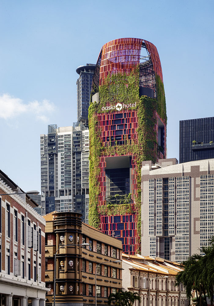 In Singapur setzt das Oasia Hotel Downtown (2016) von Woha Architects Maßstäbe. Besonders hervorzuheben ist – neben dem üppigen grünen Kleid, welches das Haus umrankt – die hybride Mischung der Nutzungen. Diese Haltung ist bei uns aus finanztechnischen Gründen – die Fonds investieren nur in Wohn- oder Gewerbeimmobilien – nicht verbreitet, aber das wird sich in Zukunft ändern. Denn diese neuen vertikalen Dörfer sind die Zukunft. Ihre Mischung aus Flächen für Büros, Hotels, Parken, Gastronomie und Freizeitaktivitäten – wie einem Schwimmbad auf dem Dach – sorgt für eine zeitlich differenzierte Nutzung. Das wirkt sich positiv auf die gesamte Immobilie, ihre Umgebung und auch ihre soziale Bedeutung aus. Hier wird 24/7 genutzt, und zwar nicht nur zu Berufsverkehrszeiten.