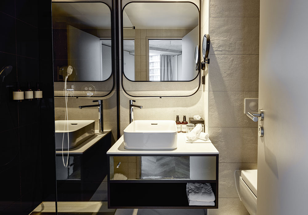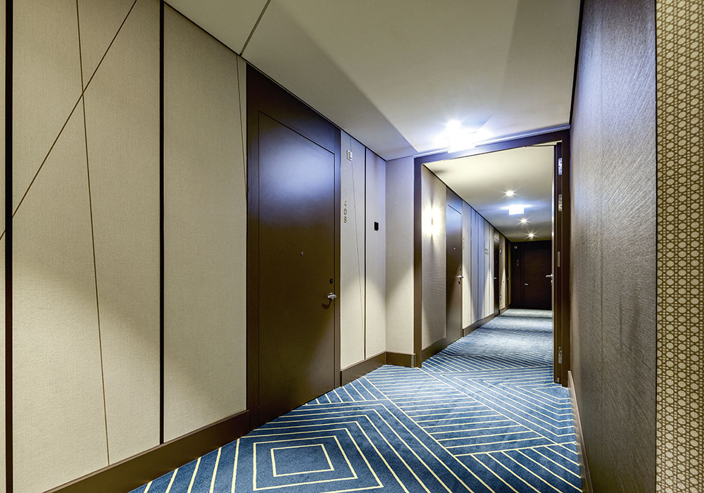 Hotelzimmertüren sind in der Regel Schallschutztüren mit Rauchschutzfunktion. Im NH Hotel bekamen die Zimmer jedoch T30-Brandschutztüren; Brandabschnitte sind mit T90-Brandschutztüren unterteilt. Die Nassraumzellen sind in Spanien vorgefertigt worden und wurden fertig zusammengebaut geliefert und in die Zimmer eingefügt. Vor Ort wurden dann nur noch rund 7,5 Zentimeter starke Leichtbauwände eingezogen und die Türen mit Hörmann Stahlzargen eingebaut.