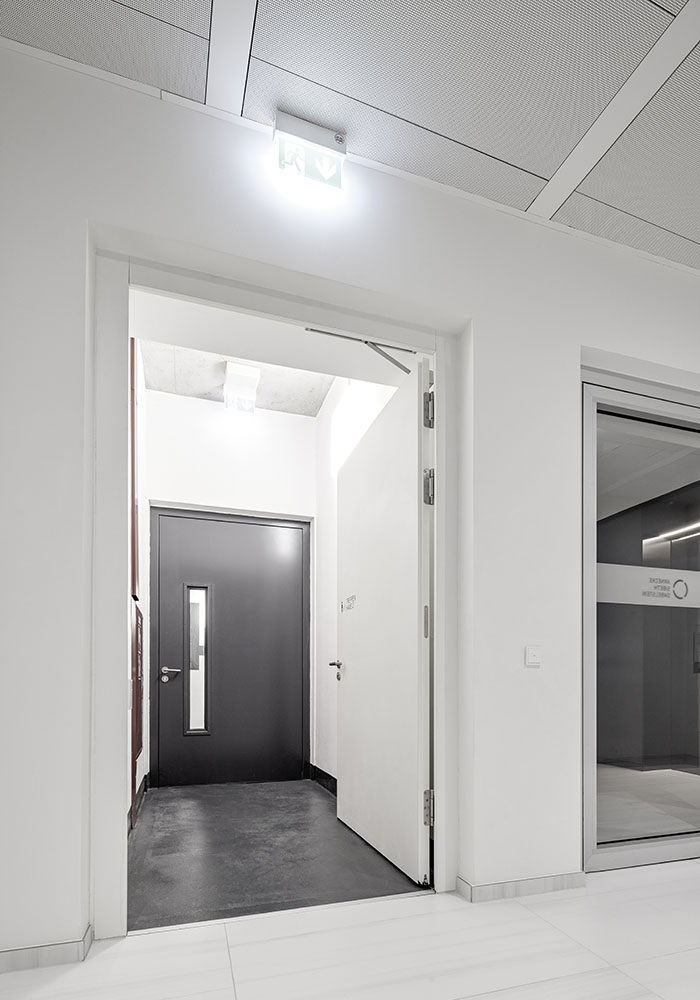 Hochhäuser ab einer gewissen Größe brauchen zwei notwendige Treppenhäuser. Im Brandfall wird dort der Luftdruck erhöht, damit sie rauchfrei bleiben. Als zusätzlicher Schutz dienen Schleusentüren. Sie bestehen im „The Spin“ aus einer T30-Brandschutztür aus Stahl von Hörmann auf der Seite der Treppenhäuser und einer T30-Brandschutztür aus Holz von Schörghuber auf der Seite der Flure. Der Raum dazwischen hat – wie das Treppenhaus – einen erhöhten Luftdruck, damit auch er rauchfrei bleibt. Zusätzlich ist er an die Entrauchungsanlage angeschlossen. Beide Türen sind mit einem automatischen Obertürschließer versehen, der sowohl im Normalbetrieb als auch im Brandfall die Tür selbstständig schließen muss.