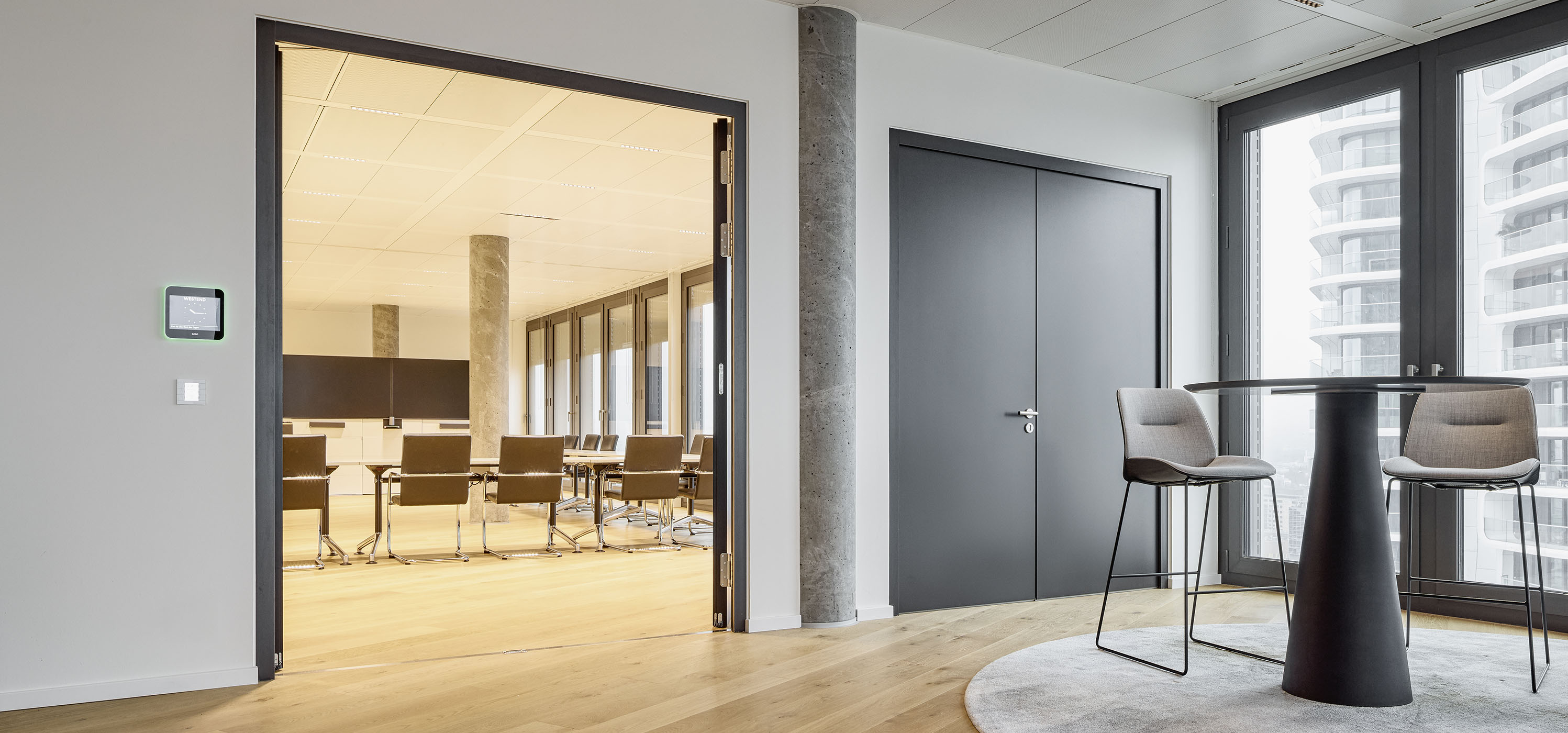 Im Lobbybereich gibt es eine Tapetentür, die sich direkt hinter der Rezeption befindet. Sie ist mit derselben grafischen Oberfläche wie die Wand belegt und somit kaum sichtbar. In den Konferenzsälen des NH Hotels sind zweiflügelige Türen mit Oberblende verbaut. Die Türen in den Büroebenen wurden nach den Wünschen der Mieter gestaltet.